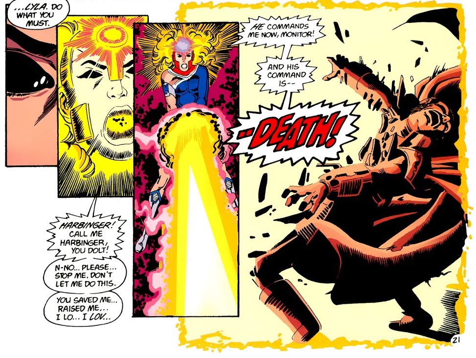 Crisis on Infinite Earths #4 was an eventful issue for The Monitor. Not only did he turn Kimiyo Hoshi into Doctor Light; he also died at the hands of his closest confidant. Earlier in the series, while recruiting heroes from across the multiverse, Harbinger is attacked and infected by one of The Anti-Monitor’s shadow demons. The infection allows The Anti-Monitor to take control of Lyla, and ultimately to use her to murder The Monitor towards the end of Crisis #4.