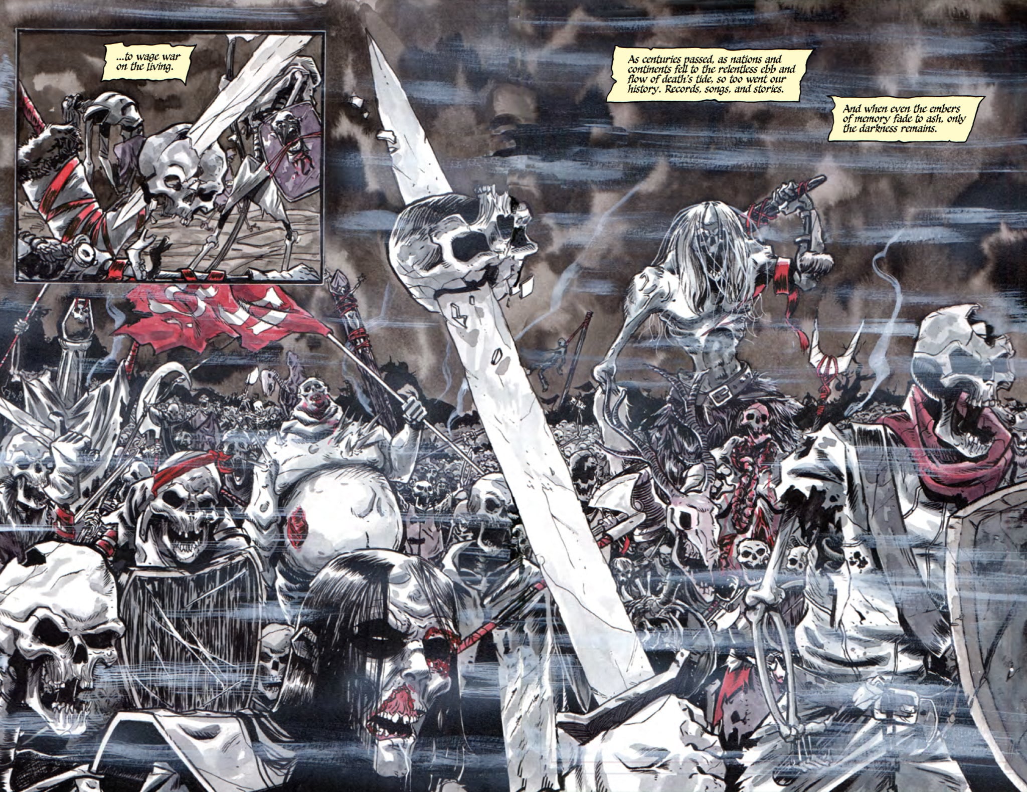 So yes, that is perhaps the first thing you will notice about these comics. The skeletons. Most of which are waring armor and wielding medieval weaponry. They are rendered to heavy metal cover art perfection by artist Kelly Williams. Written by Girner with design and lettering by Jeff Powell, The Dead and the Damned is is a comic that lets you know what’s for sale right up front, with a brief three-panel page one intro (see above) before jumping right into a pair of dark fantasy warfare splashes that will blow you away with detail, from the diversity of the undead army withing the first one (see below) to the absurdity of the violence (flying severed head, anyone?…also, see below below) in the second.