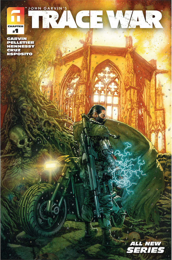 Trace War is planned as a three-issue mini series with artwork by Paul Pelletier (Aquaman, Guardians of the Galaxy, et al), Brett Booth (Backlash, Gunslinger), Tony Harris (Starman, Ex Machina), and more. As with Days Gone – which had a 12,000 script – Garvin is working to make the world of Trace War immersive and detailed. And making comics is the perfect way to approach that kind of storytelling, he told us.