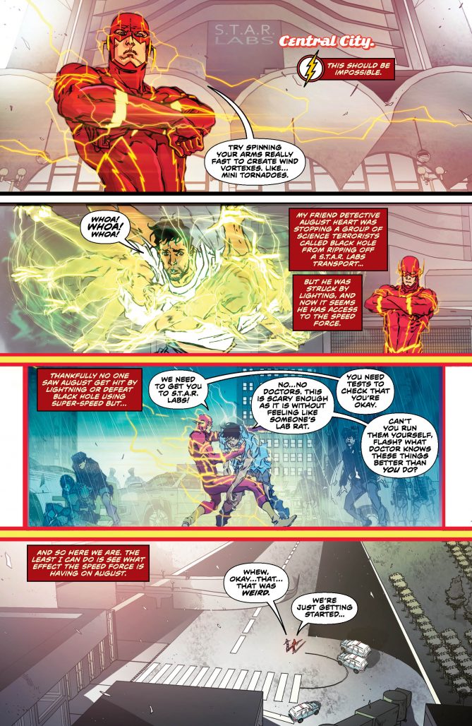 The central focus of this issue is Barry Allen’s friend, fellow Central City P.D. member August Heart. At the end of the previous issue, August was struck by a bolt of lightning from the Speed Force during a hostage situation, giving him the same powers as Barry. While Williamson could have easily dedicated several issues to August’s struggle to control his abilities, he smartly cuts right to the chase instead and condenses August’s education into a quick training montage led by Barry himself. There is a great deal of levity in these moments as August reacts with incredulity at everything that Barry shows him from creating tornadoes to phasing through walls. These moments of humor then immediately contrast with August’s serious face when he realizes Barry is The Flash. It’s a reveal that’s played for drama, but that particular revelation does not end up becoming a major plot point. It is instead resolved in a heart to heart that reaffirms their brotherhood and allows Williamson to focus on the greater plot at hand.