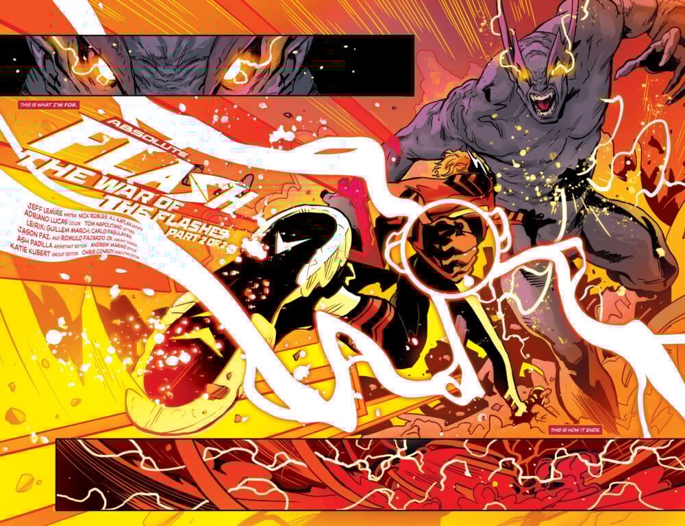 But the book has felt at times too decompressed for my tastes, maybe just a bit too patient. As noted in my headline here, Absolute Flash #12 is the most consequential issue of the book yet. It’s labeled as the finale of a two-part storyline titled The War of the Flashes, and I guess technically it is that. But it actually feels more like it’s the finale of the first year of the title, a culmination of everything that’s happened since the book launched, a clear delineation point between what happened before and whatever the book’s next phase will look like.
