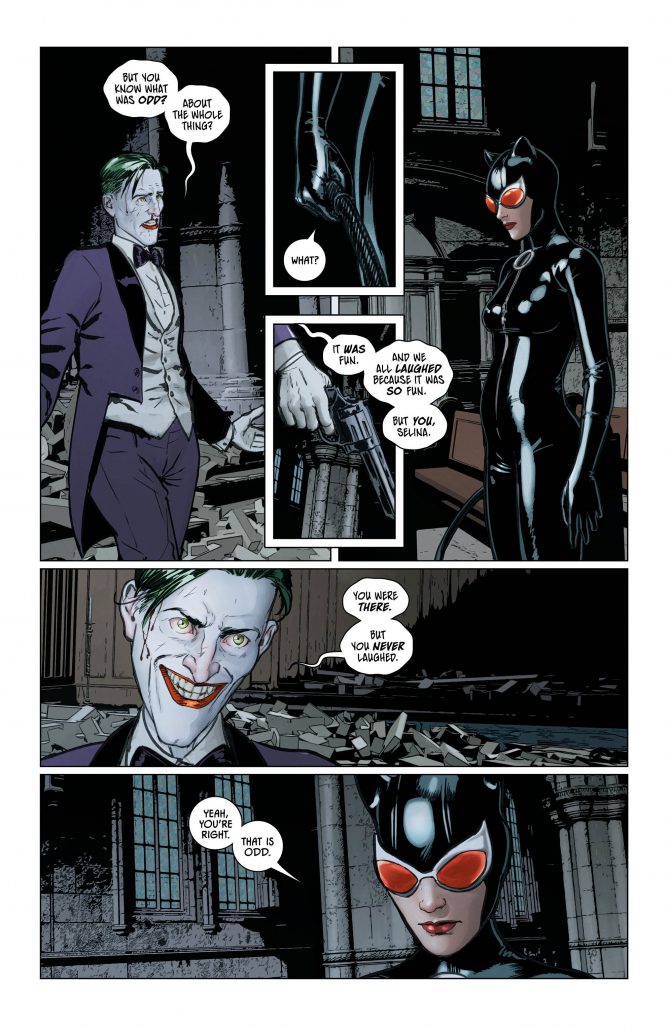 And indeed, as Batman #49 goes on, we learn the reason why the Joker lured the Cat and the Bat to him on this night. While some takes on the Joker present him as a motivationless agent of chaos, I prefer takes on the character where chaos is more of a means to another end. And that’s what we get here. Adhering to much of what was established about the Joker by Scott Snyder and Greg Capullo, King and Janin show us a Joker paralyzed by fear of a Batman who might find too much joy in his life to put on the cowl again. A happy Batman cannot exist, he argues, so the only way to make sure the Joker’s fun can continue is to make sure Batman is never happy.