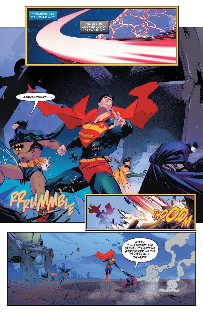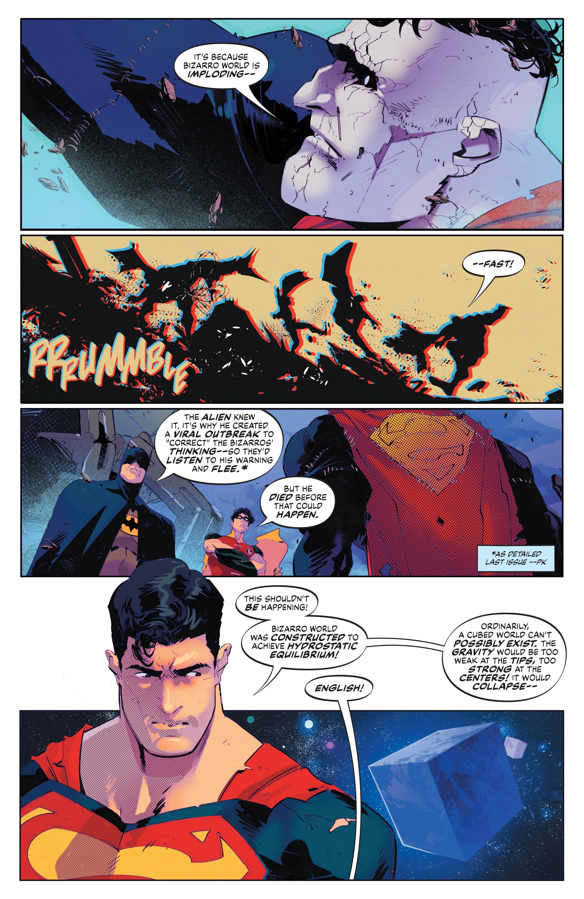 Waid does this so well that you can’t help but feel an attachment to the lumbering brutes that are Bizarro #1 and Batzarro. Infected by the alien intelligence virus that has ravaged their world, they are forced to embrace their newfound intellect, working with their counterparts in order to give their world a better chance. Robin’s role here also shines, acting as the outsider who sees what even Superman and Batman can’t. He stands out for the same reason he does in the main universe: as the light in the darkness, bridging the human with both the dark and the alien. It leads to a standout moment between Batzarro, Batman, and Robin that lingers long after the issue is done.