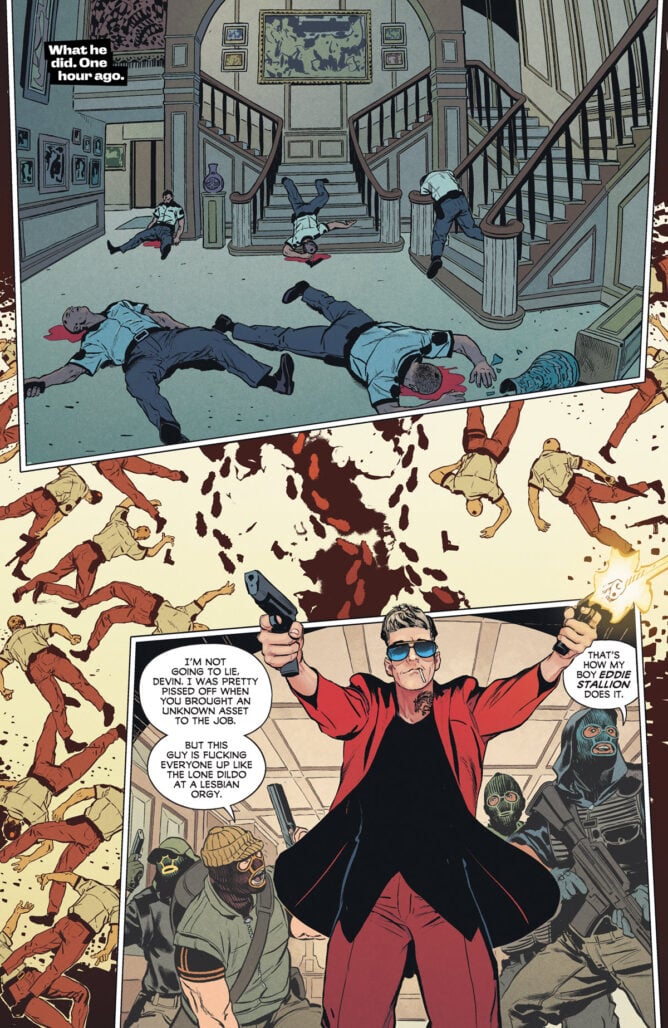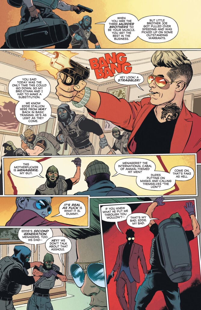Steve Pugh and colorist Chris O’Halloran’s artwork sets the perfect tone for this story. The visuals are the perfect mix of realistic and heightened cartoonishness, particularly when it comes to Eddie himself, whose facial expressions and body language are enough to tell the reader everything they need to know about him. His outfit, his neck tattoo, his smug-yet-doofus-y face – it’s a perfect, highly punchable package.