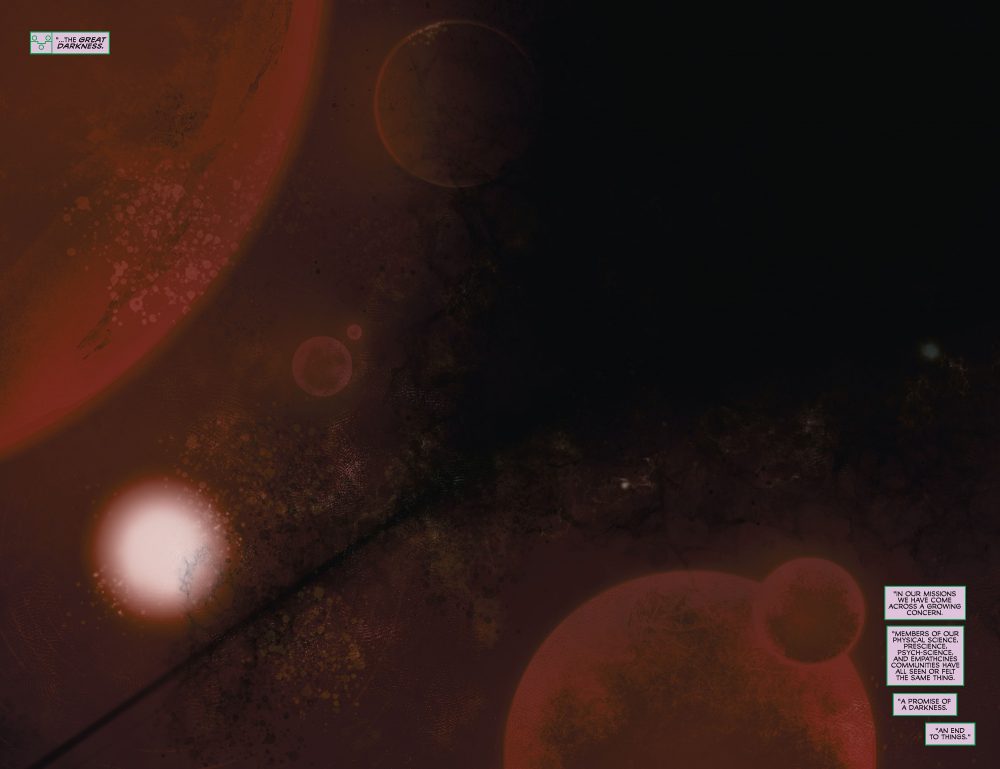 The choice that stands out the most to me within this first issue is one that has been teased in other Bendis comics. It is the series’ referencing of The Great Darkness Saga, quite possibly both the best and most fondly-remembered Legion of Super-Heroes story. First published in 1982, it’s a rare Legion comic that has remained in print continuously. It was written by a very young Paul Levitz with art by Keith Giffen and Larry Mahlstedt, and it’s certainly my personal favorite Legion story. The Levitz-Giffen run is a real gem, with the writer doing a great job of blending Ursula K. Le Guin-esque deep space anthropology with teen superhero drama, all powered by striking Giffen artwork that still holds up well by the standards of today, even brandishing a strong influence on the current era of cosmic superhero visuals, in my opinion.