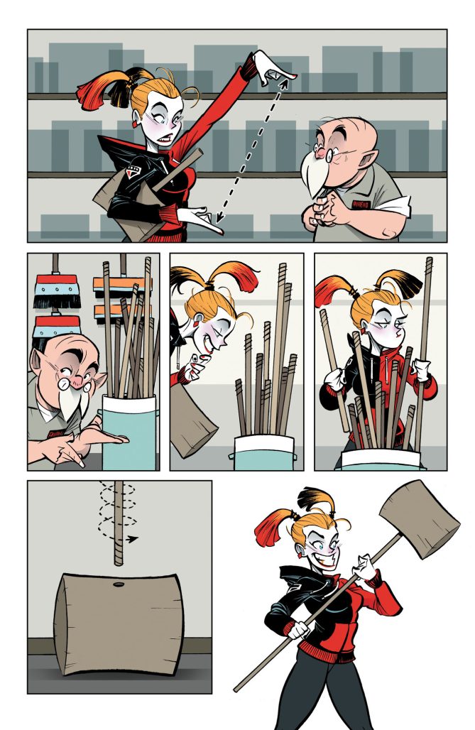 Cartoonist Gustavo Duarte is at the top of his game with this comic, and really captures emotions and pacing extremely well in each individual story. Right from the start, the facial acting of the poor little shopkeeper tasked with selling Harley Quinn a mallet is just top-notch. You can feel his fear as she reaches for her wallet, and his relief when she leaves without incident.