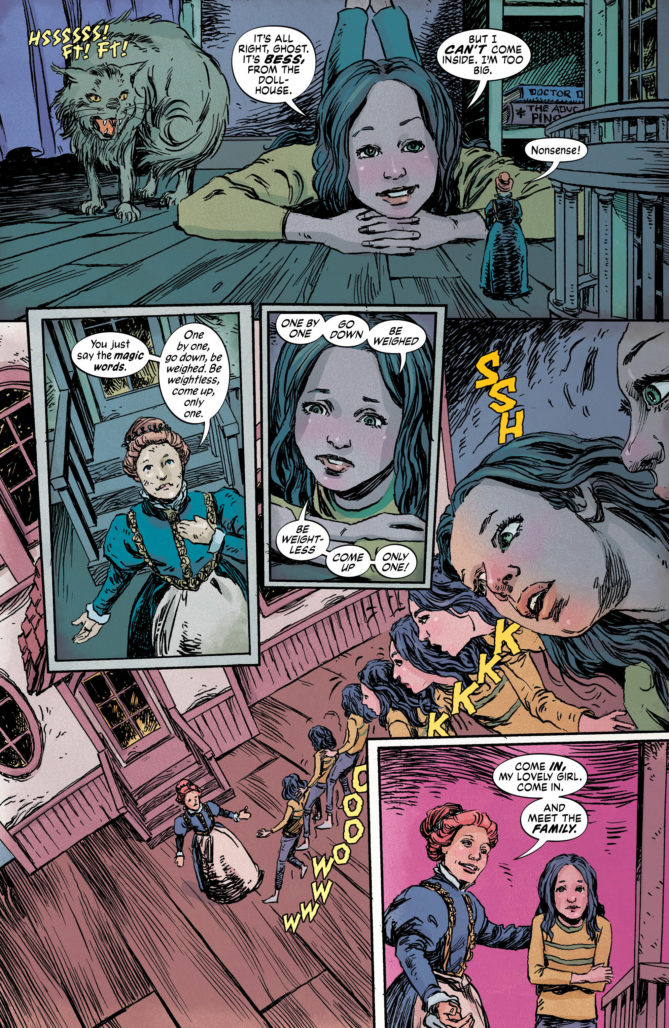 About the book itself, Dollhouse Family #1 is an intriguing and audacious first issue, one that much like Far Sector gives reader something intellectually meaty to chew on while trusting them to make connections. It’s a story of a dollhouse with some sort of power that spans back through the ages, and it’s narrative bounces through time periods to draw the relevant connections. The real narrative engine here is a young girl whose father is violent and abusive, so much so that he’s clearly begun to put her mother’s life at risk. At the same time, she’s come into possession of this dollhouse, charged as it is with dark magic. The tension of the story is derived from the dollhouse seemingly having the power to destroy her father and save her mother, but it may want to make her a miniaturized and permanent resident as its price.