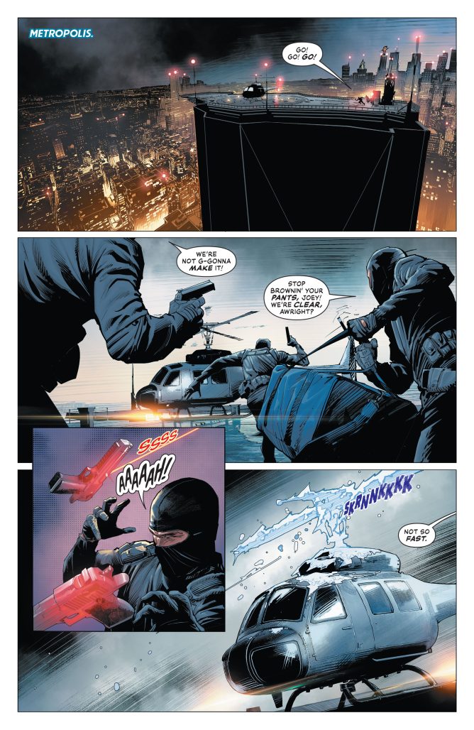 Story-wise, I enjoyed this first issue quite a bit. It’s organized with a great set piece to open things (see the above pages), wherein Superman confidently confronts some burglars escaping via a rooftop helicopter…only to find he’s been de-powered once they fire at him. Going out of chronology to let a flashy bit open is common in comics, and I’m not always a fan of it — but bullets bouncing off Superman is so iconic, that I enjoyed the way this subverts reader expectations. And, I mean, this is a visual medium and this event within it’s opening salvo already serves up a very memorable splash page.