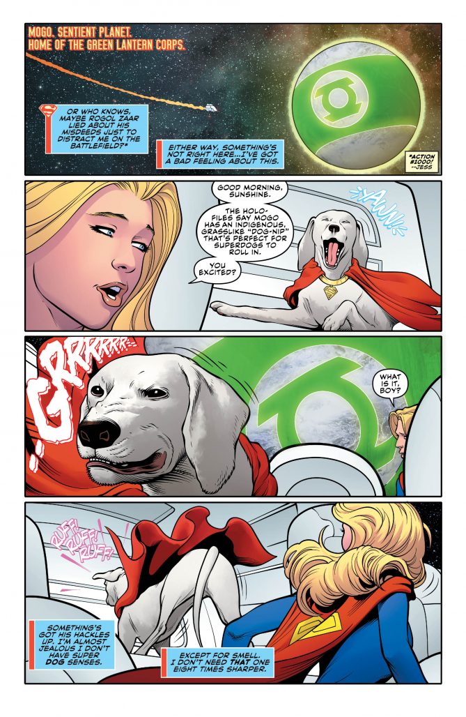 While this story arc — titled “The Killers of Krypton” — obviously has a heavy undertone, Supergirl #22 manages to remain a lighthearted book with plenty of cute moments. Her companion is the sweet supermutt Krypto, who naps in the back of her spaceship and creates small whirlwinds by wagging his tail. When the ship loses control and flips upside down, Kara faceplants into the windshield with a satisfying THWACK! She then insults Green Lantern officer B’dg by calling him a squirrel (and let’s face it, he’s basically a space squirrel) before Krypto starts chasing him across the night sky.