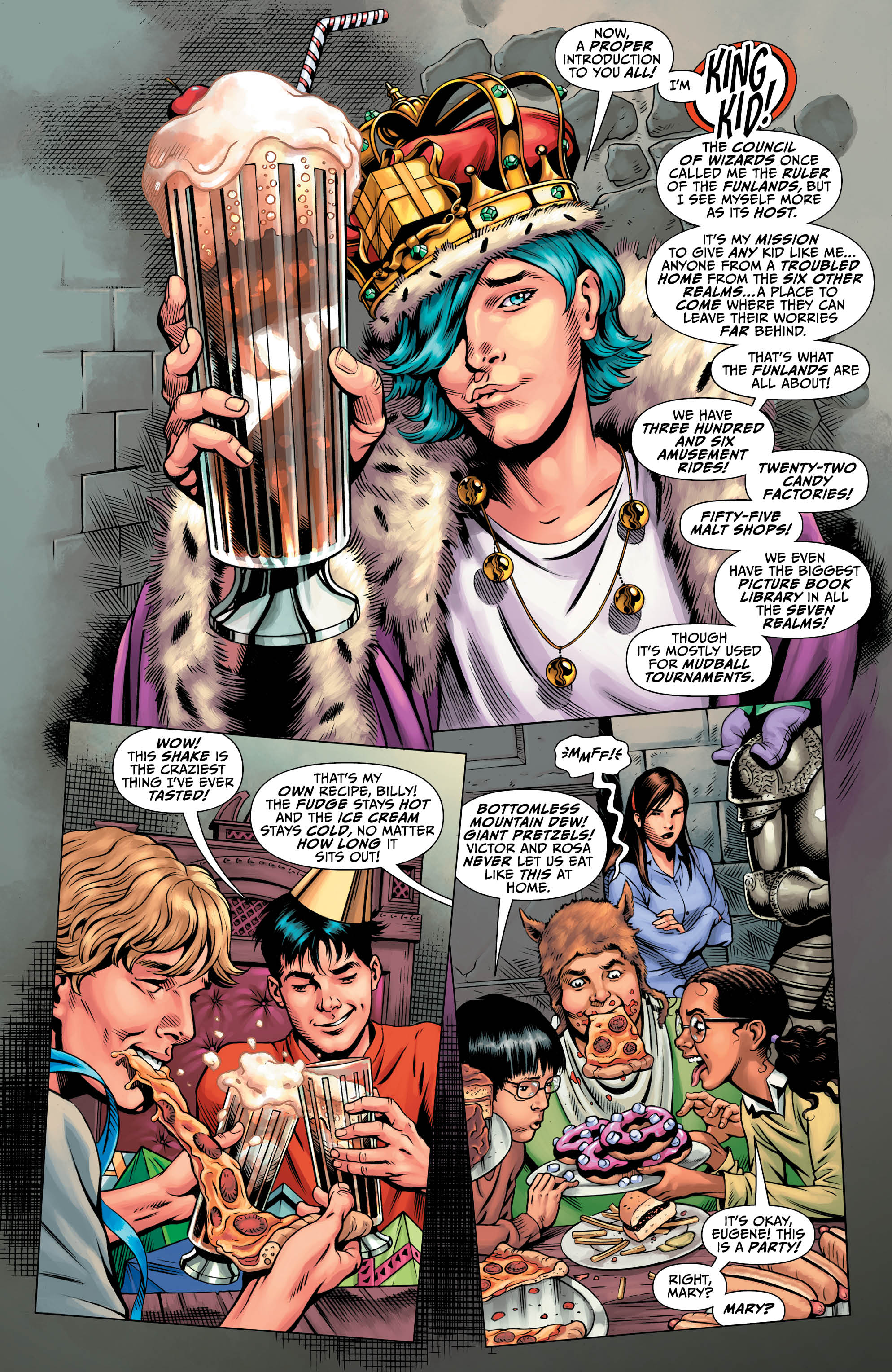 In this issue, the foster siblings find themselves in the Funlands, one of six magical worlds beyond their own that the siblings have gained access to via a subway station buried in the Rock of Eternity. The Funlands basically function like Peter Pan’s Neverland with the aesthetic of the Candy Land board game. Ruled over by a blue-haired teen who identifies himself as King Kid, the Funlands are a place where abandoned and abused children can escape to and find refuge from adults– whom are generally regarded as persona non grata. King Kid claims himself to be the seventh sibling that Billy and his fellow kids have always needed– as his logic goes, there are seven lands (including the Earthlands), so there must be seven protectors as well.