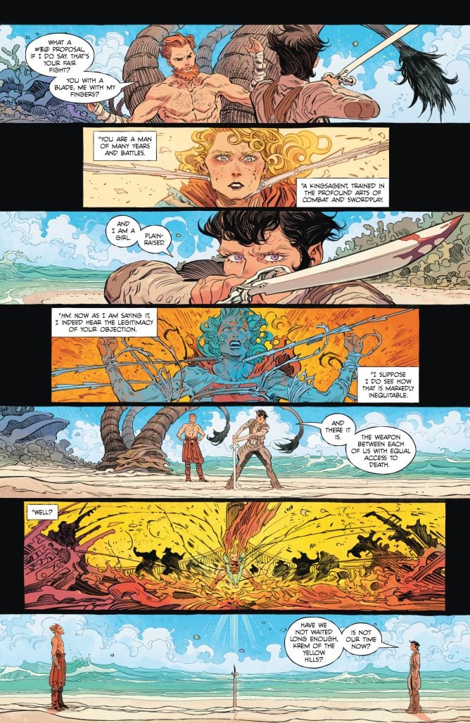 Then we have the other premise the story was built around. That at the end of the series, Supergirl, not Ruthye, would enact vengeance upon Krem of the Yellow Hills, taking his life. In the end, that too was a lie. A falsehood predicated by Ruthye to sell a book about her story, a lie told to keep herself safe from retribution from Krem’s allies. This is a plot twist that worked for the story, but once again it felt a bit cheap, if only because it’s become such a reliable trope of Tom King stories. It’s become a cliche for him to reveal some key part of the mystery in the penultimate or final issue of whatever series he’s writing, and then seemingly pat himself on the back for a job well done when it was impossible for the reader to ever get there on their own. It’s a disingenuous and lazy way to write a mystery, but it happens again and again with King.
