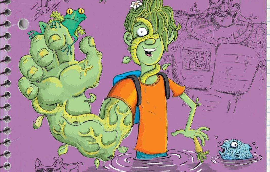 Okay, if you are still with us, here is what we can share: Russell is a middle schooler; he excessively doodles; he has two best friends, Charlotte and Preston; he is not so great at sports; and he is pond scum. Nicknamed “Swamp Kid” by his classmates, Russell has algae for hair, a tree trunk for a right arm, and a parsnip for a thumb. Also, Russell’s favorite meal is sunlight. Also, a frog lives in his arm.