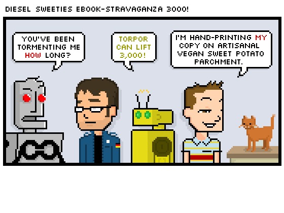 Also like Order of the Stick, Diesel Sweeties is a long-running, popular webcomic. You may recall that Diesel Sweeties even crossed over to print as a daily newspaper comic strip for a while, before Stevens decided to pull back his focus to the web product.