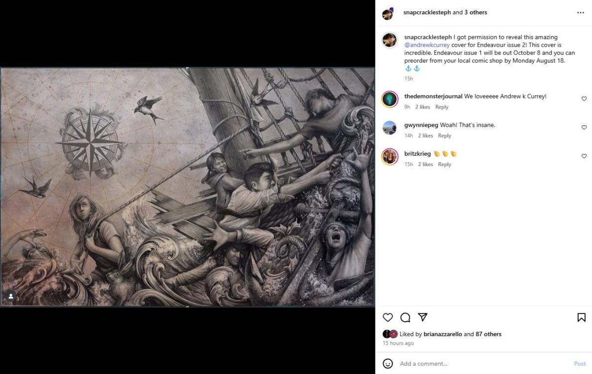 The team at DSTLRY has also released the art for the cover of Endeavour issue #2 by Andrew K. Currey. Check it out below: