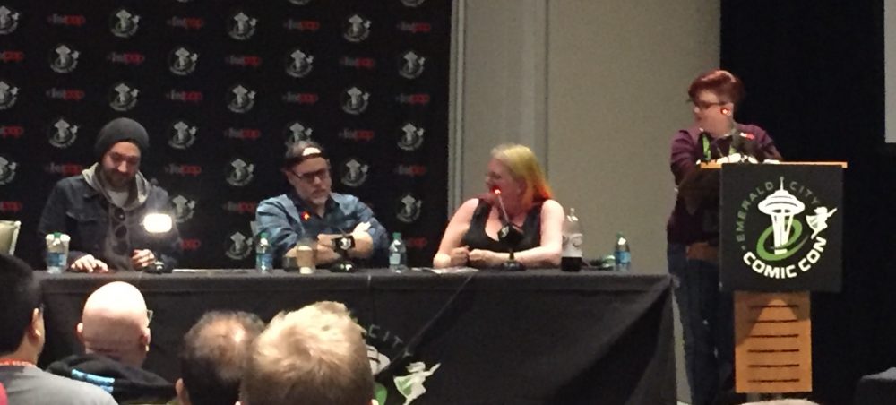 Spider-Gwen is still bonded to a symbiote in her universe, and McGuire quickly clarified that her symbiote is synthetic, built in a lab. Whether it was built from a true symbiote remains to be seen, though she has no plans to explore that in her run on Gwen’s book. The panelists joked that a benefit of having a symbiote is not having to do laundry. Smith asked what the panelists would do if they had symbiotes; Cates said he would go evil immediately, while Latour said he would make his draw Southern Bastards.