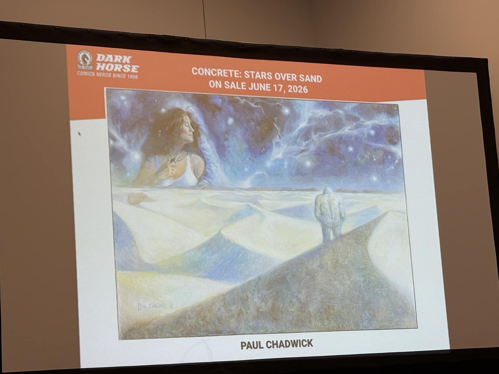 As announced during ComicsPRO, Paul Chadwick’s acclaimed Concrete will be returning in a new miniseries entitled Stars and Sands. The panel unveiled an art piece by Dave Rubin showcasing various creator-owned characters of Dark Horse.