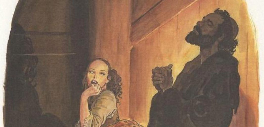 Manara is a comics master who has long specialized in erotic art and drawing women in sexually available postures. IN 2014, in one of the first comics kerfuffles of the Twitter era, he came under fire for a sexy Spiderwoman cover., and has often draw criticism for objectifying women. This particular image, which suggests that living a life devoted to religion is compromised by the sex act, therefore reinforcing a harmful dichotomy between two natural and normal human activities, was from The Libertines, (NSFW). It’s a series of prints illustrating poems by 17th century writer Jean de La Fontaine that included similar rales of “voyeurism, bigotry and lust.” You can see the original right here (NSFW).