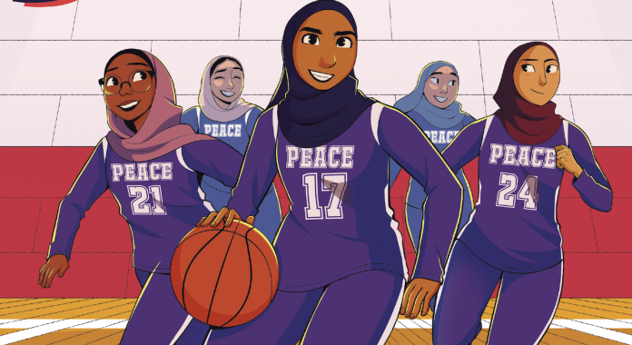 The description continues: “As an avid basketball fan and Muslim, Hena set out to learn as much as possible about this team and their journey from underdogs to absolute powerhouses on the court, scouring national news coverage about the team and interviewing the coach and several players.” And the result? “[T]his empowering graphic novel about Aliya and the Peace Academy team as they discover that it takes more than talent to be great, and true success comes from teamwork and self-confidence.”