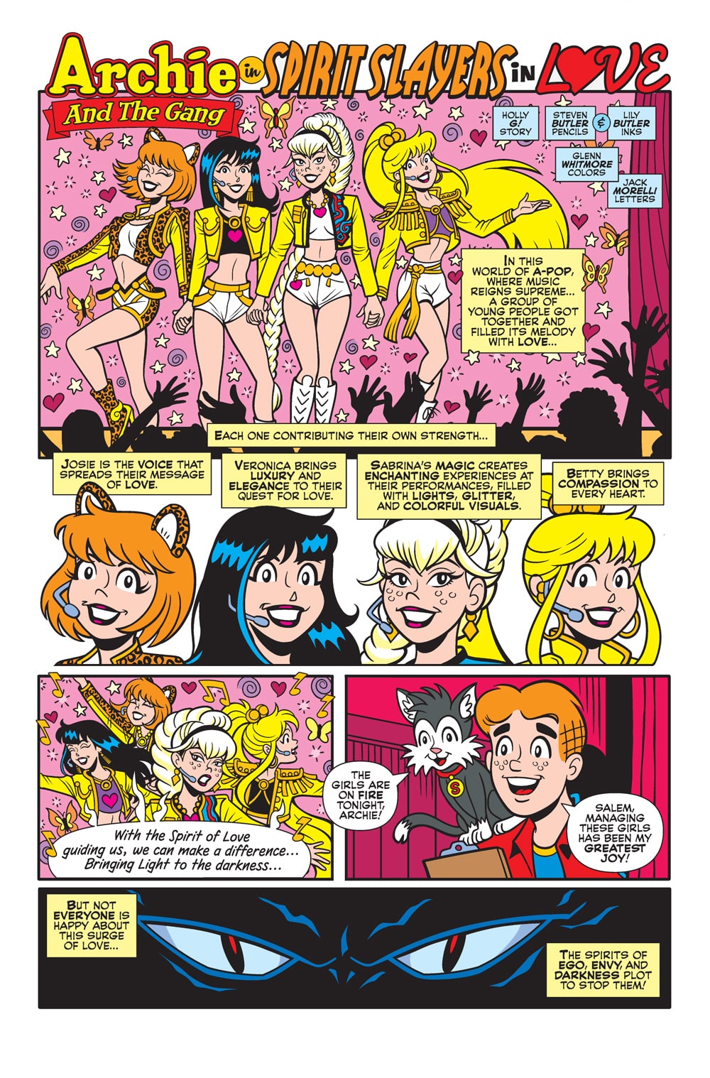 The OFFICIAL COMIC BOOK OF VALENTINE’S DAY returns with a BRAND NEW STORY! A-POP is a vibrant world fueled by music and love—and when Sabrina, Betty, Veronica, and Josie form a band (managed by Archie!) to spread joy and compassion, they catch the eye of a dark spirit that’s threatened by their positivity. Can they rise above his dark influence? Find out in this fun KPop Demon Hunters-style story, along with even more romance-filled tales than ever!