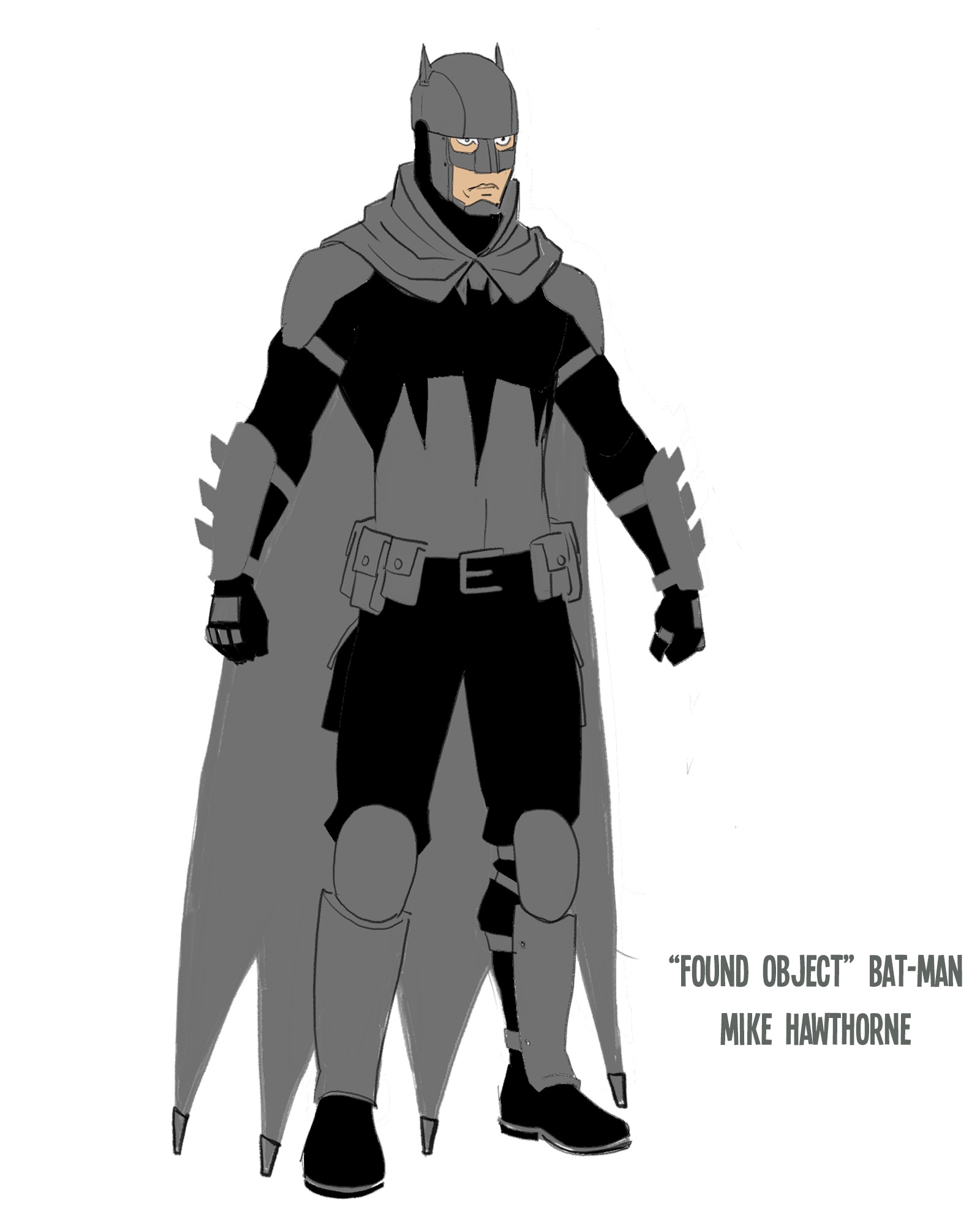 Even when building a suit based on found objects, though, Bruce Wayne would always have his eye towards practicality, something Hawthorne kept in mind in designing each piece of the suit. “I was thinking, he’s going to be using sports gear in a protective way, so that helmet thing, I did a version that was more based on an actual motorcycle helmet, which I abandoned because it was a little too big and protective,” the artist elaborated. “I did a couple of different versions based on bike helmets or skate helmets. And then [for] the final design I landed on sort of a combination. The helmet part is sort of a skate helmet, and the pieces that go down the side of his face are based on Olympic boxing [helmets], they sort of have the guards going down the side to keep from getting knocked out every match. The nose guard and face part were based on a version of a hockey helmet I saw online.”
