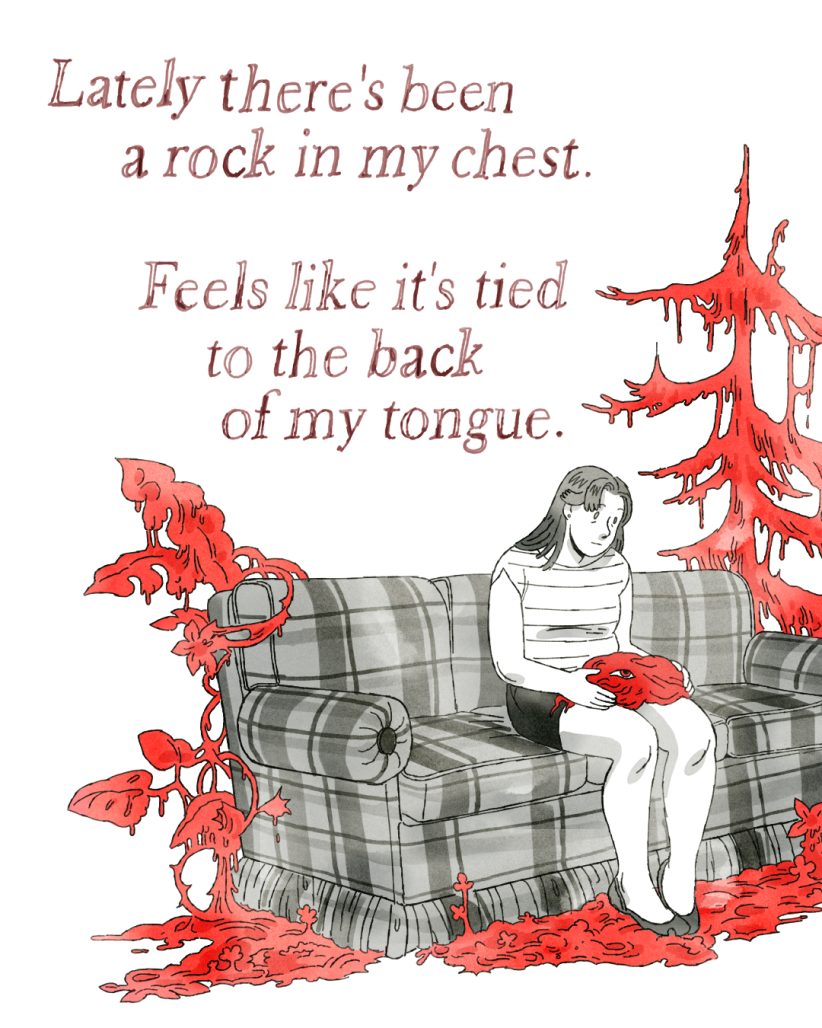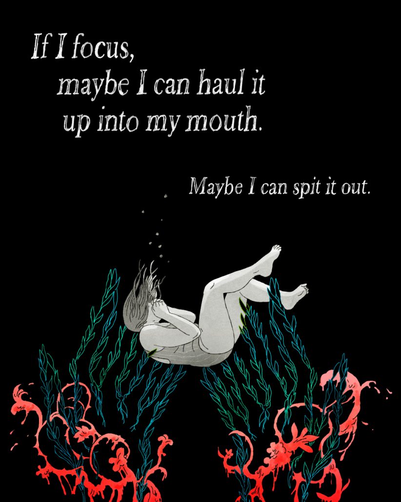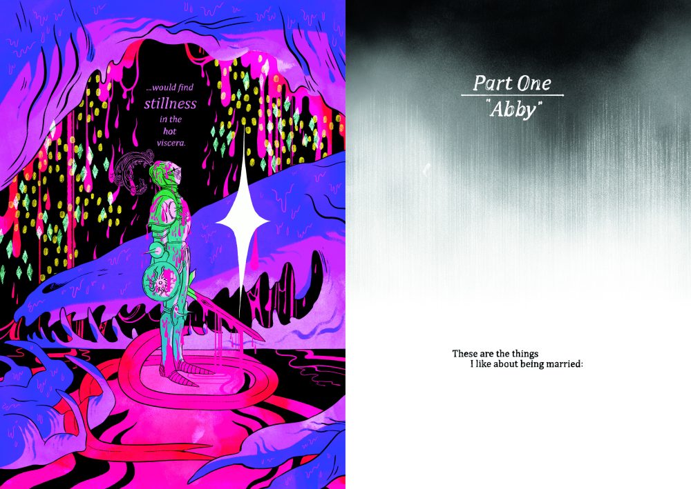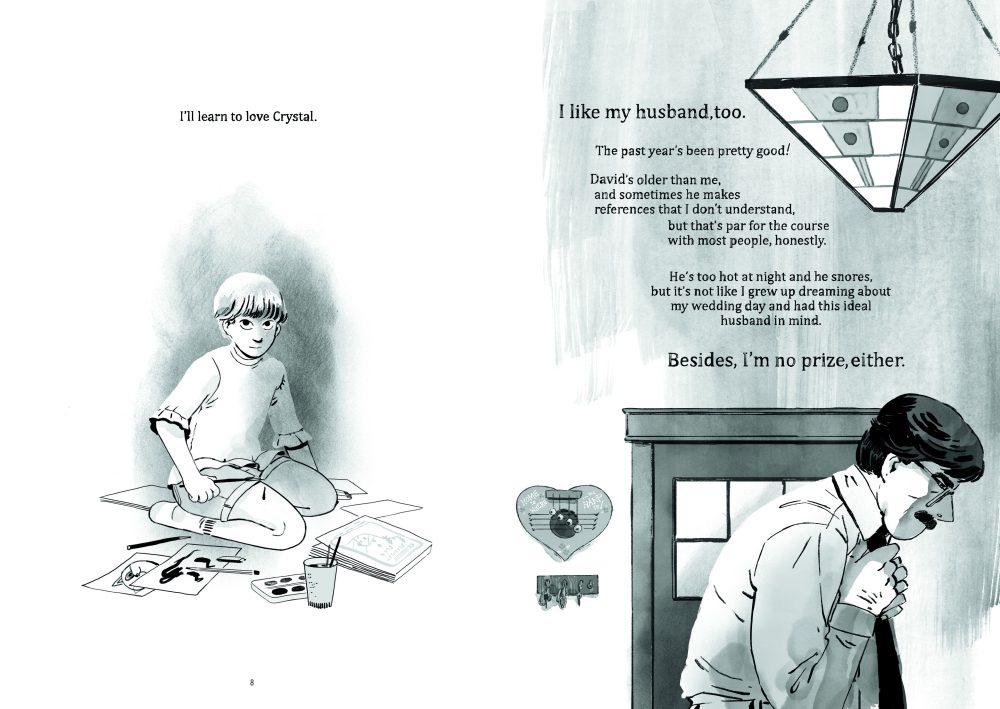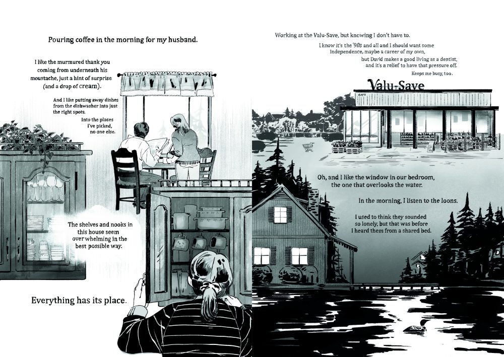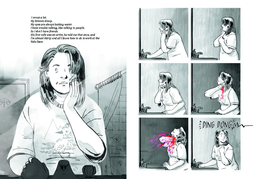 As seen in the opening of the book above, Carroll illustrates the majority of A Guest in the House in monochrome, but turns to vibrant colors to explore Abby’s inner world. The same is true of the new, never-before-seen art they created for the paperback edition, seen below. These panels aren’t in the paperback itself, but were created separately to celebrate its release.