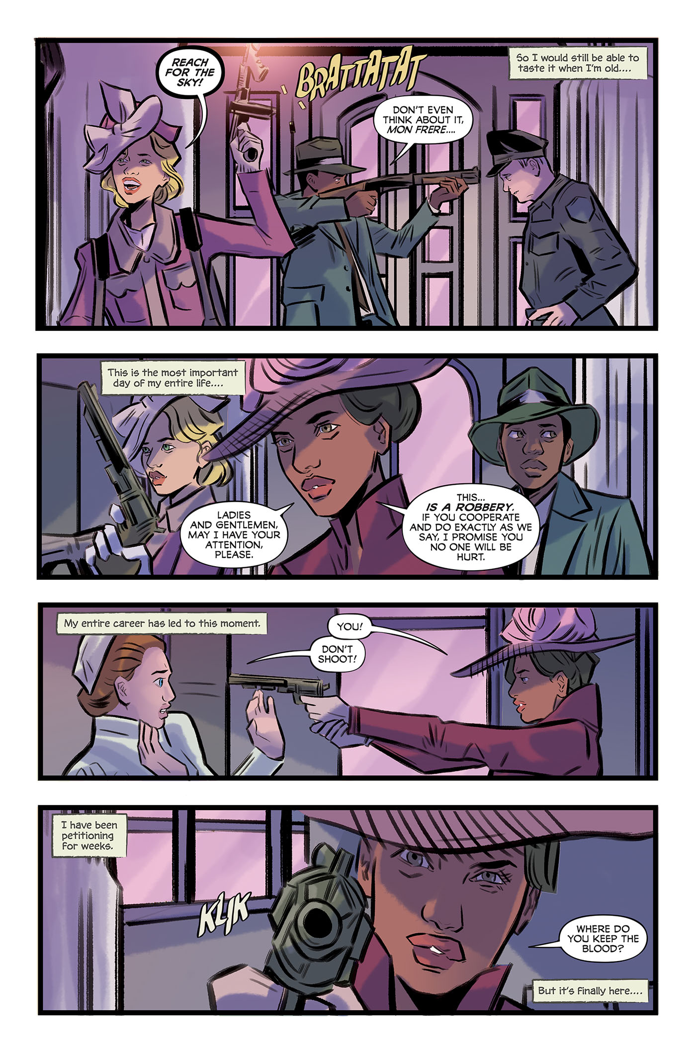 Rahal: THE VAIN is essentially The Lost Boys meets Bonnie and Clyde. Buffy meets the Fade Out. A five-issue miniseries that spans nearly a century of American history in which we discover that our undead anti-heroes might be able to style themselves for the decades, but they can’t keep up with the times. It’s a story about wild eternal youth, reckless rebellion and endless love. I’m really excited at how absolutely beautiful this series is. Emily Pearson, the artist/co-creator, has done delicate character work on top of such stunning backgrounds. Our colorist, Fred Stresing, and our color assistant, Macy Khan, have created a romantic palette. One that enriches every single page. And the airtightness of Crank! on letters has been excellent. Although I am currently coming out with another story featuring vampires. I assure you… this is something different. Emily and I have pushed ourselves. And I think we have made something special.
