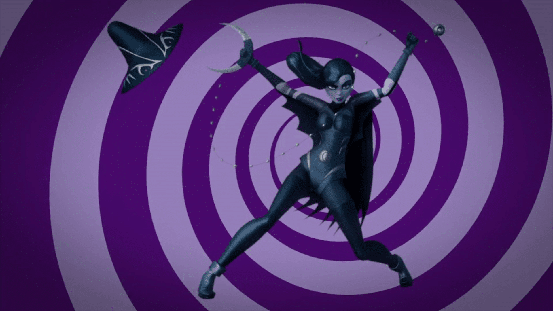 The Beat is proud to exclusively unveil Shinigami character design art by Soo Lee. Fans will note that the comics version of Shinigami retains the iconic witch hat and trademark crescent blades and kusarigama weapons as her animated counterpart. Check it out below as well as the Shinigami’s animated character design sheet from Ciro Nieli for comparison.