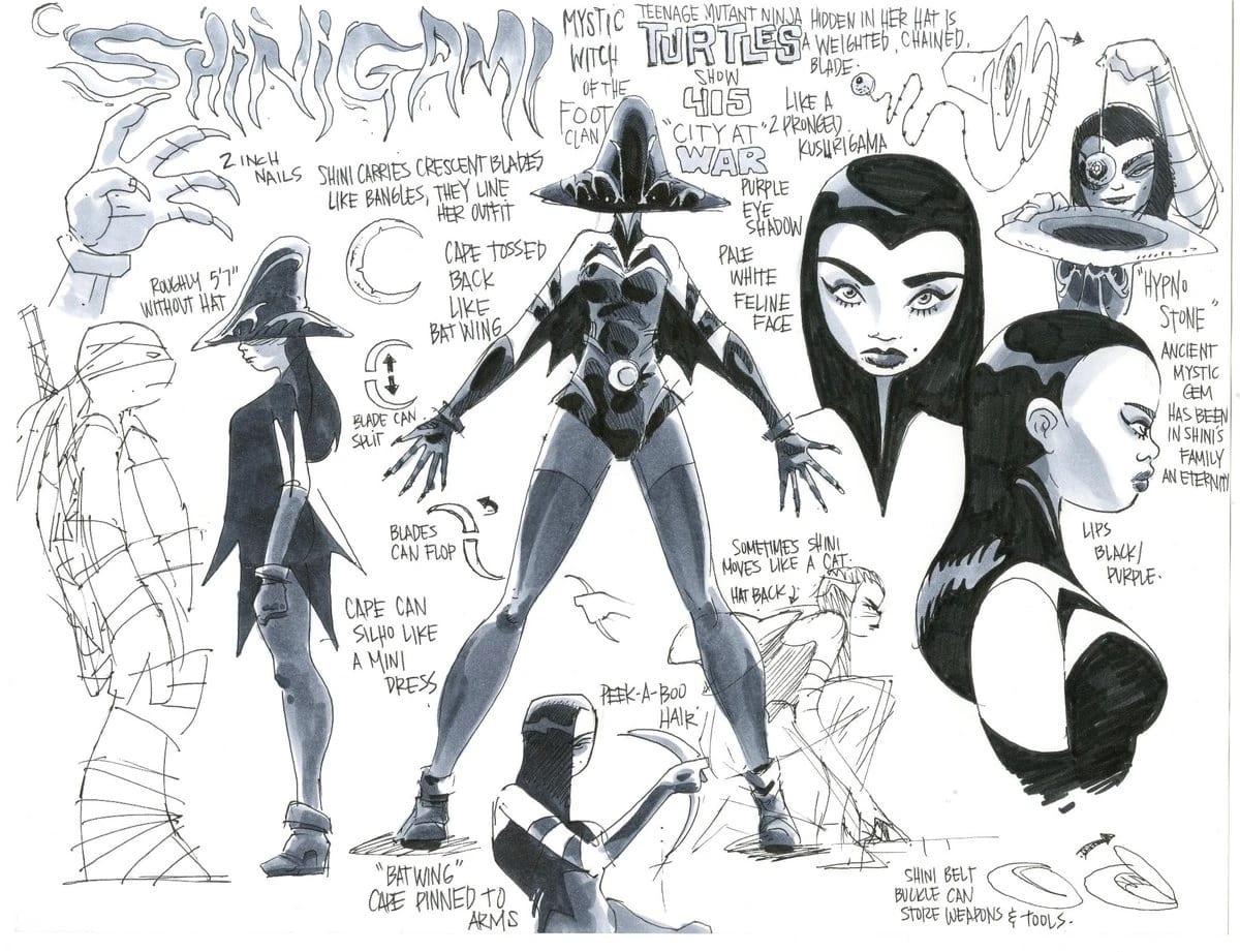 “When I was given a chance to design a character for TMNT I was honestly very excited since it’s a rare opportunity for me to put my thumbprint in the legendary Turtles universe. Shinigami is a character that was shown once before so I wasn’t creating a brand new character exactly, but it does feel that way because they gave me the big honor of completely revamping this cool villain. Who can say no when they described her as a hypno cat-witch?!”