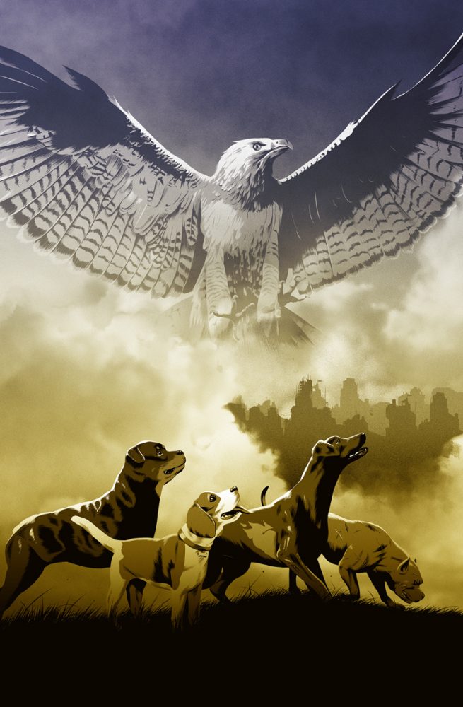In terms of inspiration, I’ve always been fascinated by animal stories. I find they can carry a lot of symbolic weight, and are fertile ground for allegory. I grew up reading (and being frightened by, to be perfectly honest) books likeWatership Down, Where the Red Fern Grows, Animal Farm, and the Redwall series. And each has stuck with me. I have vivid memories of Napoleon and Snowball, of Fiver and Bigwig, of Mattimeo and Martin the Warrior and many, many more. Seeing Princess Mononoke as an adult pushed me over the threshold, and I decided that one day I wanted to make an animal story of my own, even if I wasn’t sure what kind it would be, or whether I’d be able to do it successfully. I’m a big reader of science fiction and horror, and when thinking about what I might be able to add to the tradition of animal stories, I turned towards a ravaged earth. We3 by Grant Morrison helped me along that path, I think, as it does a spectacular job of remixing modern genre elements with animal stories of old.