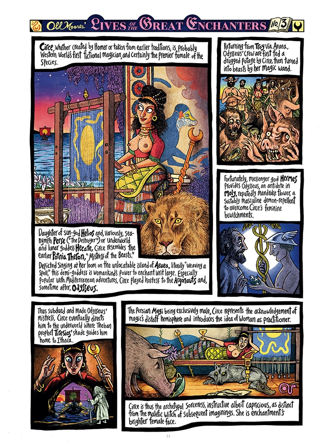 Also contained within this extravagant compendium of thaumaturgic lore is a history of magic from the last ice age to the present day, told in a series of easy-to-absorb pictorial biographies of fifty great enchanters and complemented by a variety of picture stories depicting events ranging from the Palaeolithic origins of art, magic, language, and consciousness to the rib-tickling comedy exploits of Moon and Serpent founder Alexander the False Prophet (“He’s fun, he’s fake, he’s got a talking snake!”).