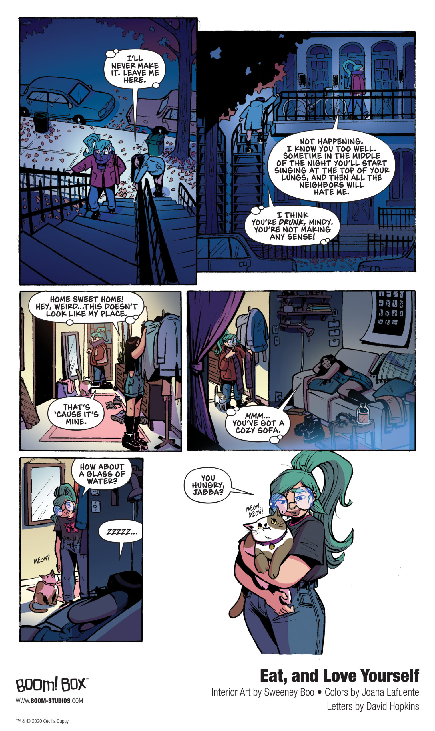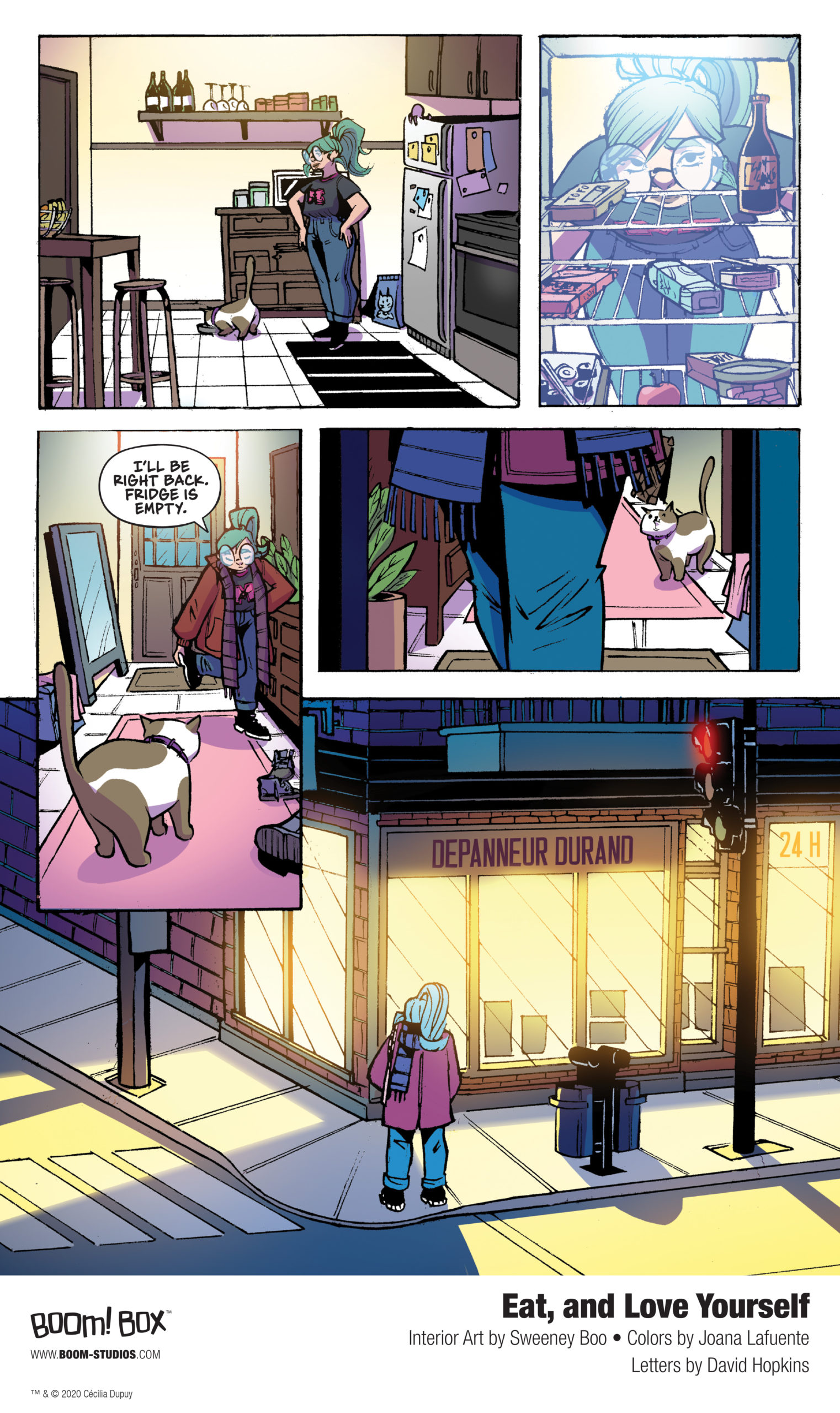 Check out a nine-page preview, exclusive to The Beat, of Eat, and Love Yourself below. Published by BOOM! Studios as part of the BOOM! Box imprint, the 160-page graphic novel is due out in comic shops on Wednesday, April 15th, with a wide release on Tuesday, April 21st. Final order cutoff for comic shops is Monday, March 23rd, 2020.