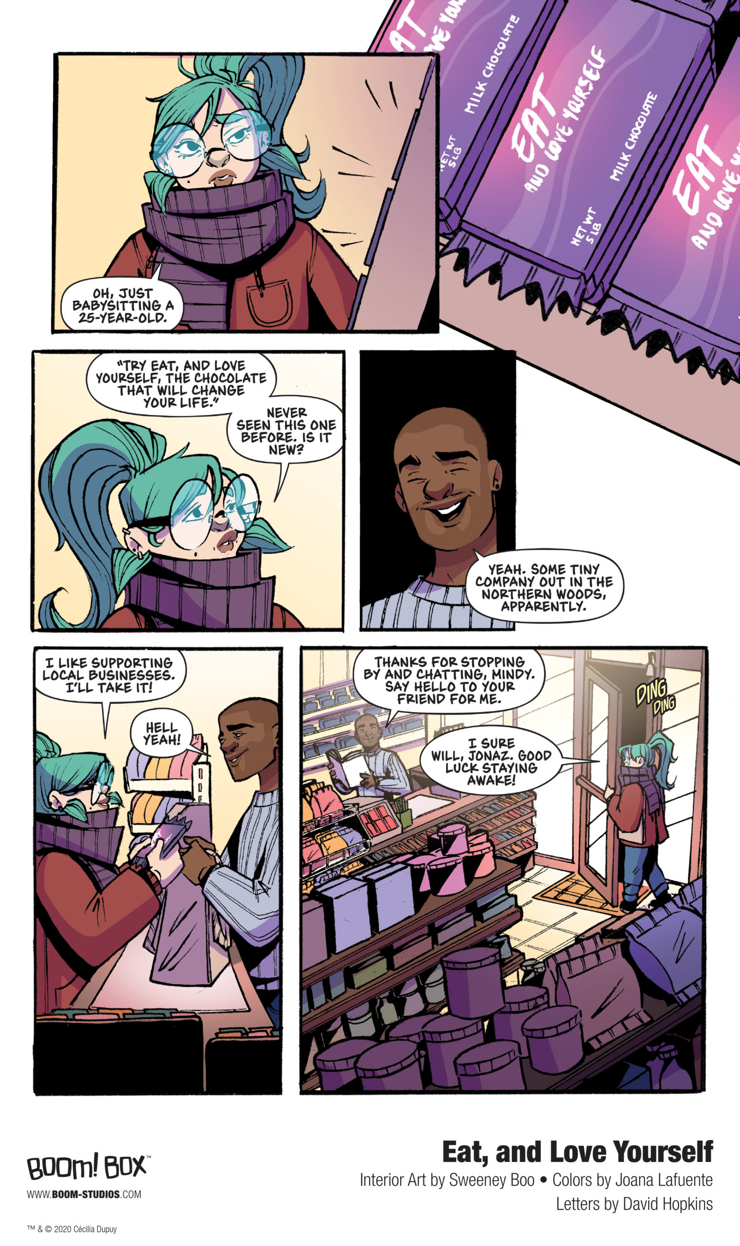 For Mindy, the protagonist in cartoonist Sweeney Boo‘s forthcoming BOOM! Box graphic novel Eat, and Love Yourself, a special chocolate bar has an entirely unexpected effect. Boo, colorist Joana Lafuente, and letterer D.C. Hopkins tell the story of Mindy, a woman with an eating disorder, as a magic bar of chocolate takes her on a journey to reckon with her past, and gives her an opportunity to learn to accept who she is. And to think, it all happened because of an impulse buy at the corner store.