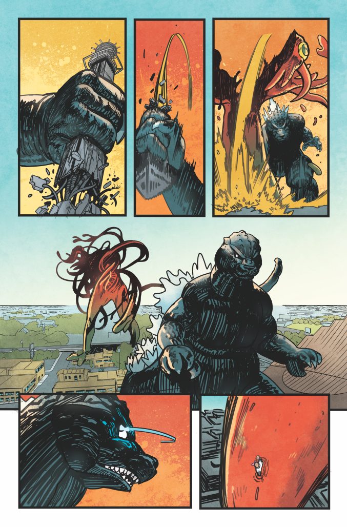 The Beat is proud to exclusively reveal preview pages of Godzilla vs. America: Kansas City. Available next month on October 29, the issue will feature stories by various Kansas City–based comics creators including Freddie E. Williams II, Baldemar Rivas, Jake Smith, Buster Moody, and more. As readers can see from the preview art below, the Kauffman Center for the Performing Arts may not fare too well. Pre-order deadline is this Monday.