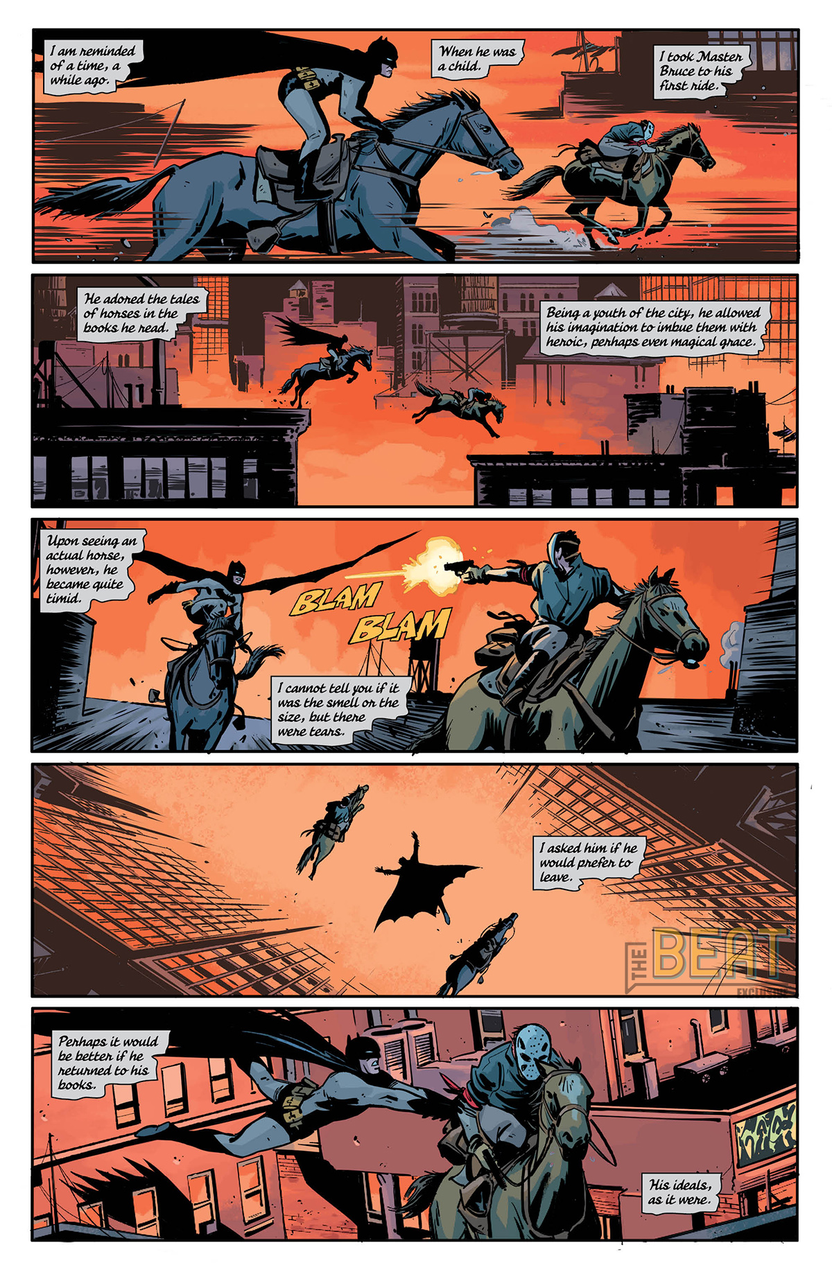 It all starts with a horse chase, but where does it end? In a magically cursed Gotham fighting dragons? Beyond that? Which of Gotham’s famous villains will make an appearance? Read on for the Beat’s exclusive preview of Batman Annual #4, out this Wednesday, where the creative team truly takes to heart the Dark Knight’s multitudinous nature.