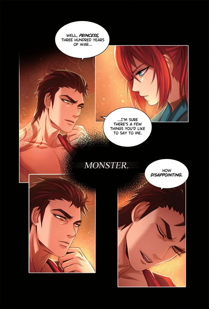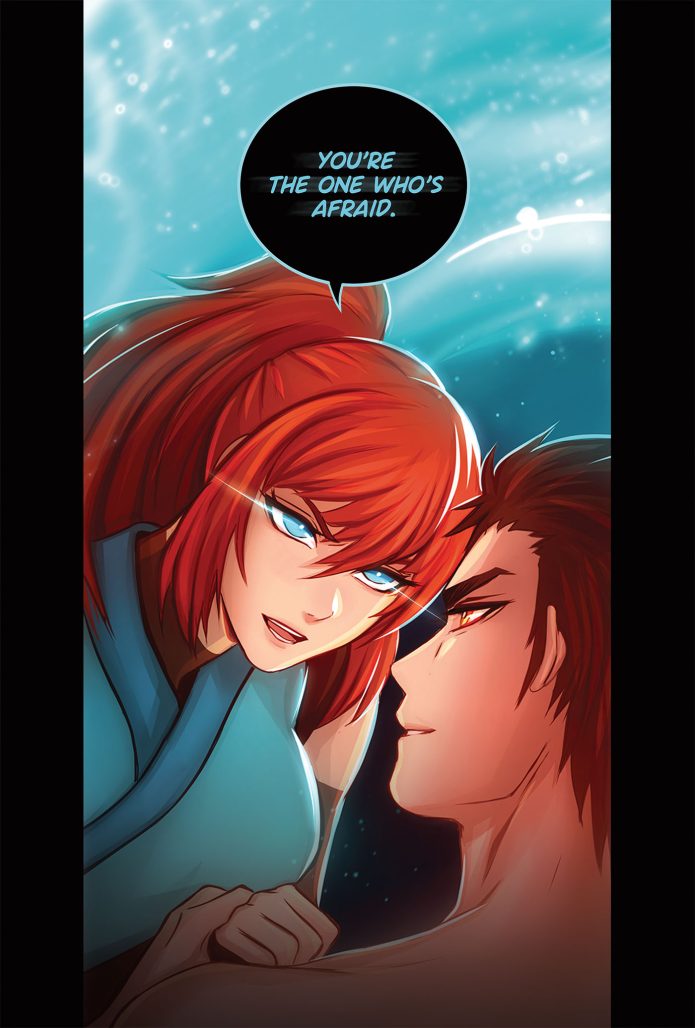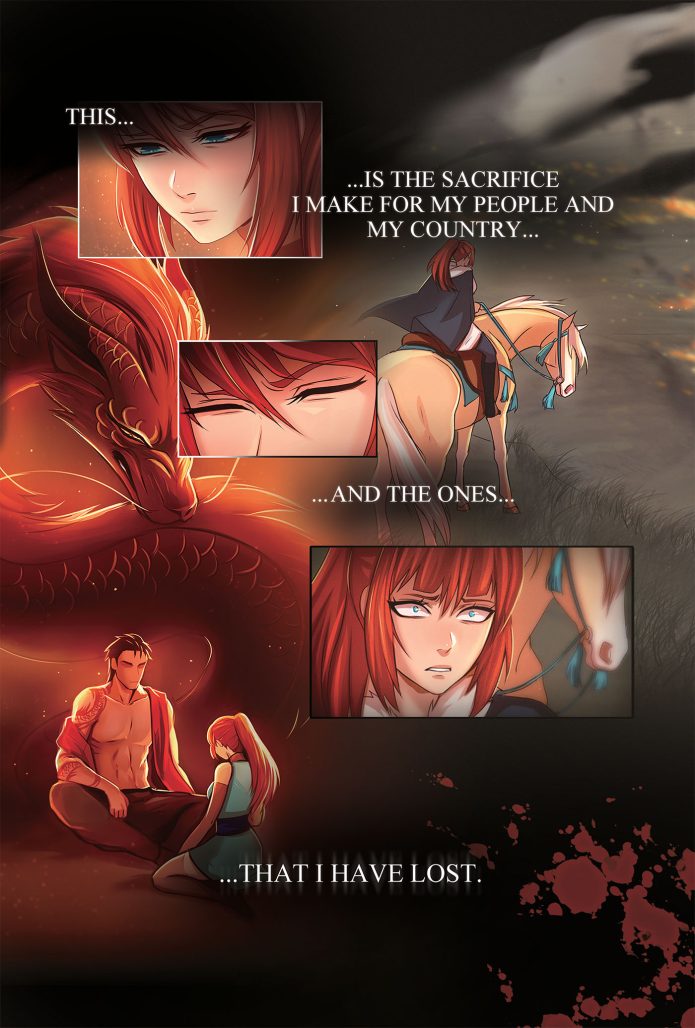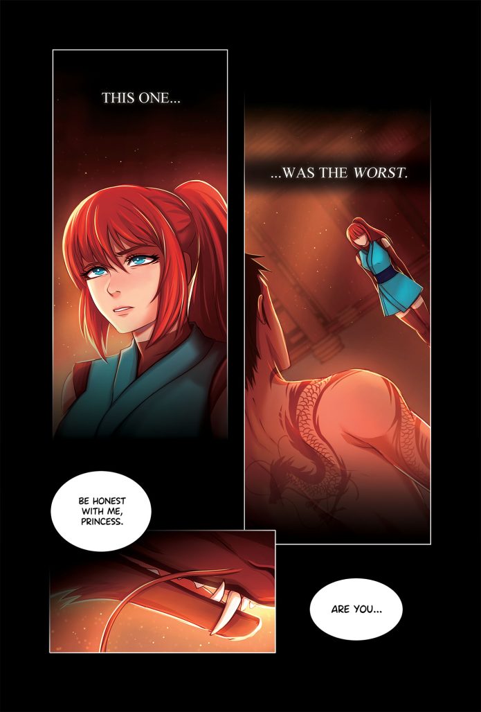 “Whenever I start a story, I like to draw the interaction between the most crucial characters to help me show off their chemistry and let the reader know what to expect. I wanted the reader to feel the Crimson Dragon’s dangerous presence as it stands next to Kyro and surrounds Clove. Very often, the Dragons’ presence is felt first by the characters before it is seen (of course we as the audience can see it). The red candle shown in the first panel is a recurring motif that plays into this. It is often shown before Kyro walks on screen and is meant to evoke a sense of mystery, passion, or danger. Fun fact, the candle was my editor’s idea and I spent an entire day painting it before we decided it was perfect!”