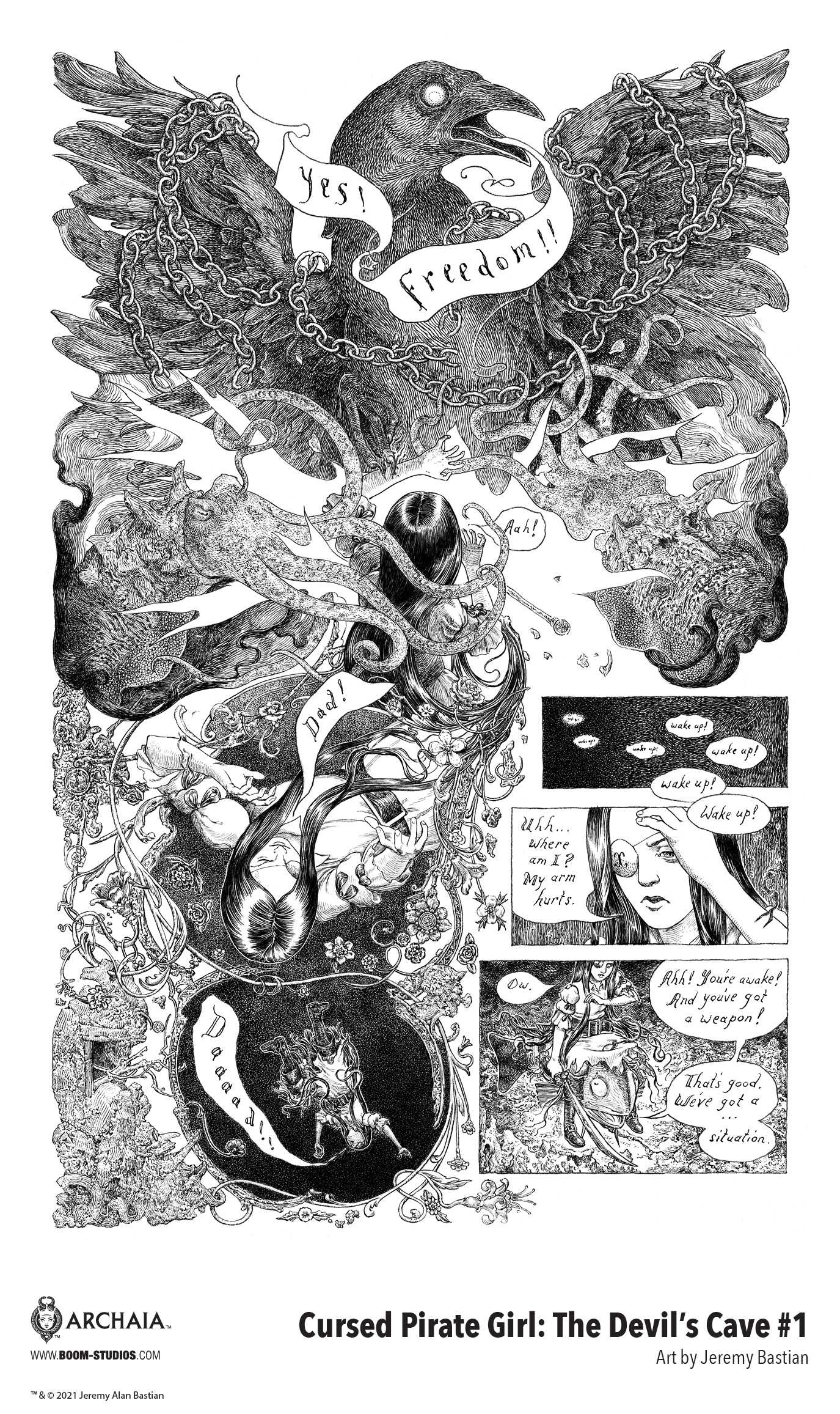 “The Devil’s Cave is the best work I have done yet, and I’m very excited to share it with you,” Bastian said in the press release. “In this long awaited chapter, Cursed Pirate Girl visits the wonders of the Omerta Seas and faces even more bizarre characters in her quest to be reunited with her father. If you thought the previous chapter of her story was something special, just wait ‘til you see this one!”