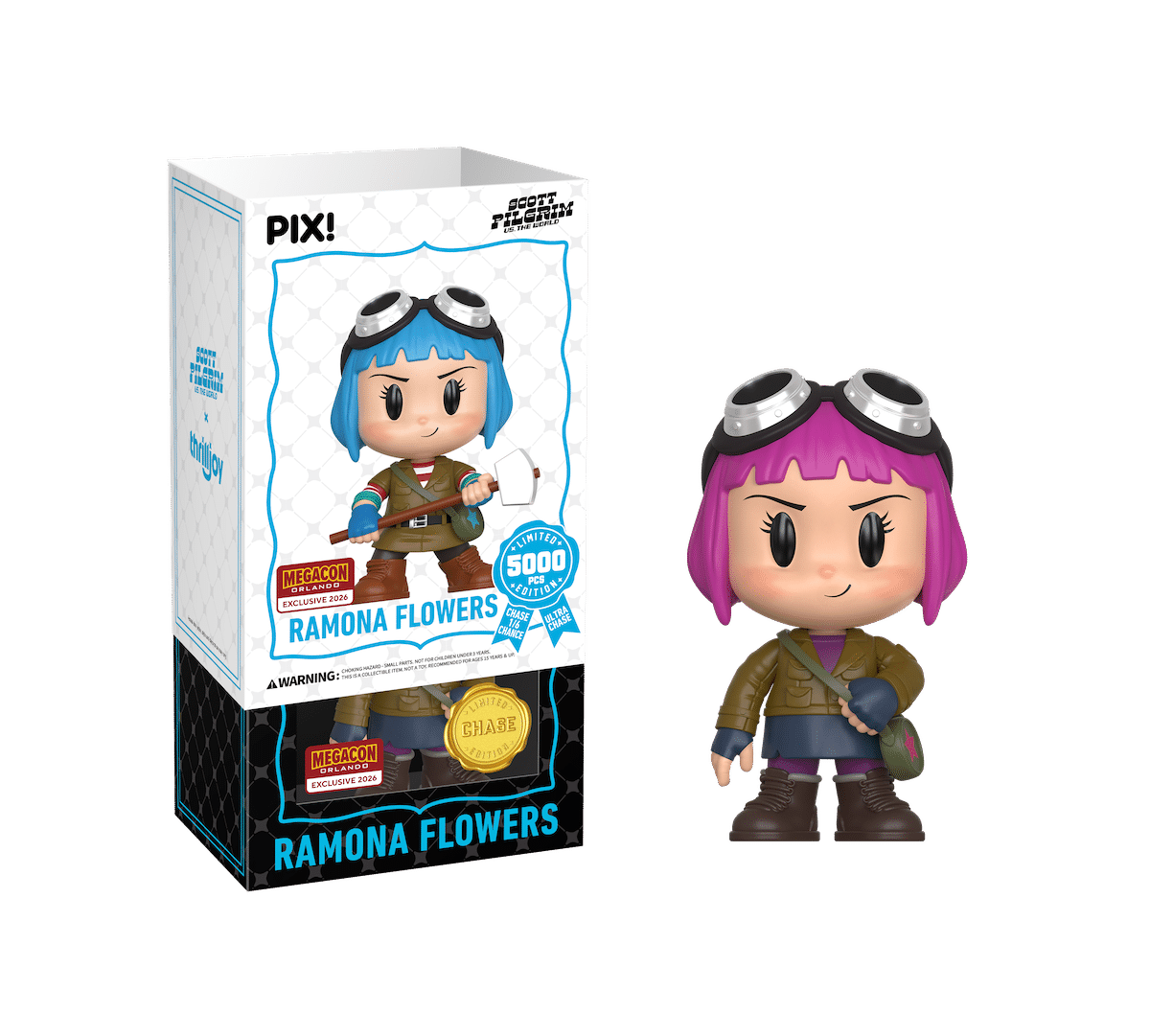 The limited edition hero edition (5k units) PIX! figure features Ramona standing tall and holding a mallet, with her signature blue hair. A 1-in-6 chase shows the character with her hand on the strap of her bag with bright pink hair, and the ultra-rare, 24-piece chase shows Ramona again holding the strap of her bag, but with her clothing and bag in a different colorway and with bright teal hair.