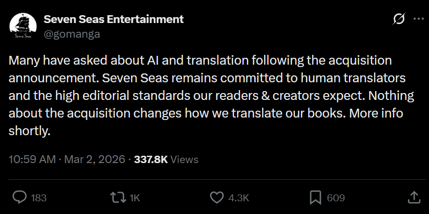 In response to the public outcries against the use of AI in its translations, Seven Seas Entertainment publicly posted on X (formerly Twitter) that it “remains committed to human translators.” Public comments exploded at the manga publisher’s recent acquisition by Japanese eBook distributor, Media Do. Many doubt the sincere attempt to provide transparency to its readers, with one user stating, “you don’t get to decide anymore.”
