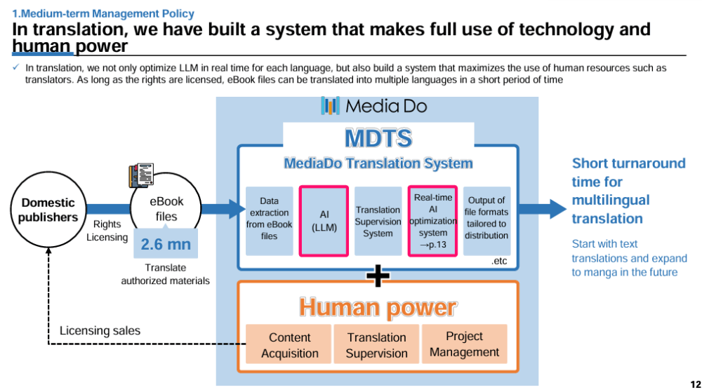Within Media Do’s previously released Medium-Term Management Plan (FYE 2/26 – FYE 2/30) on April 14, 2025, the deck extrapolates on its development of the “MDTS” (MediaDo Translation System), an AI-assisted translation system “to enable large-scale, multilingual translation.” The plan is to integrate the tool and “build a system that maximizes the use of human resources such as translators” to shorten the time for multi-language translation.
