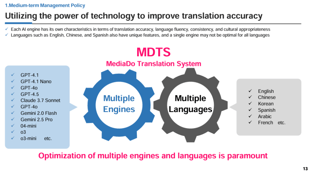 However, it specifies the “human power” portion of equation is specifically on “content acquisition, translation supervision, and project management.” It can be inferred that the human touch to the MDTS system seemingly doesn’t involve direct translation by a human being. The MDTS engine is powered by a mix of multiple engines such as GPT, Claude, Gemini.