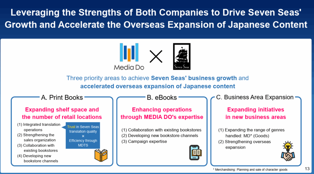 Media Do explains Seven Seas’ is “the No. 1 independent publisher in the North American manga market and holds an overwhelming position in terms of the diversity and comprehensiveness of its Japanese content.” In addition, it prizes the manga company’s strong eBook and physical distribution network, which Media Do acknowledges “the single greatest barrier to the overseas expansion of Japanese content.”