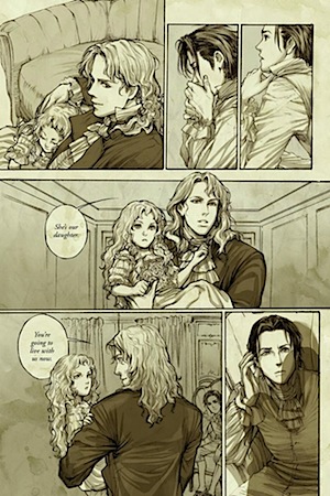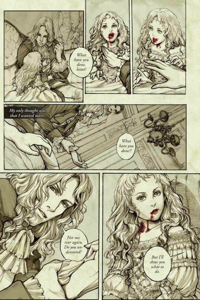 Among fall’s many anticipated releases, INTERVIEW WITH A VAMPIRE: CLAUDIA’S STORY is an interesting twist on the graphic novel anticipation. Although Anne Rice’s much-loved vampire classic has been adapted before, in both traditional comics and manga, this book has an interesting twist: it’s told from the viewpoint of Claudia, the tragic child vampire of the novel. Ruse just shared some pages from the book on her Facebook page, and newcomer Ashley Witter has done an impressive job.