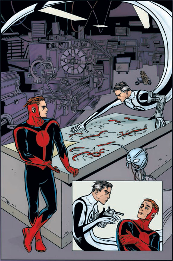 Here’s a look at a book that a lot of people will want to look at, the wacky new take on the FF by Matt Fraction and Mike Allred. The first issue ships 11/28 — and all issues will have special Marvel AR content.