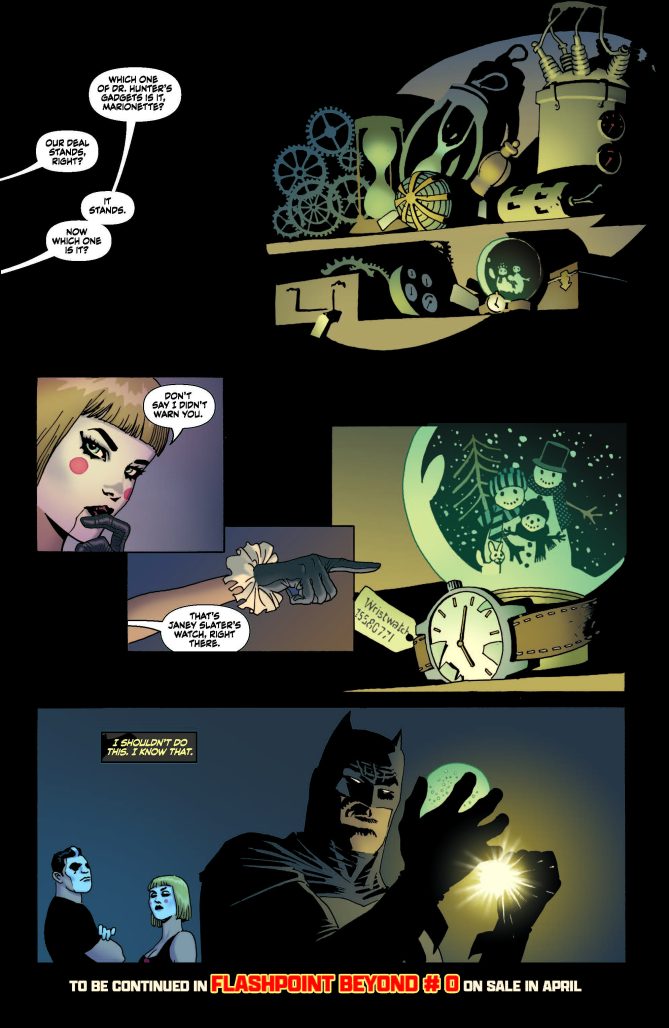 The newly-released five-page preview will appear in all DC titles shipping the weeks of March 29th and April 5th. It features Batman, Marionette, and Mime examining Rip Hunter’s old lab in search of something, which Marionette identifies as “Janey Slater’s watch.”