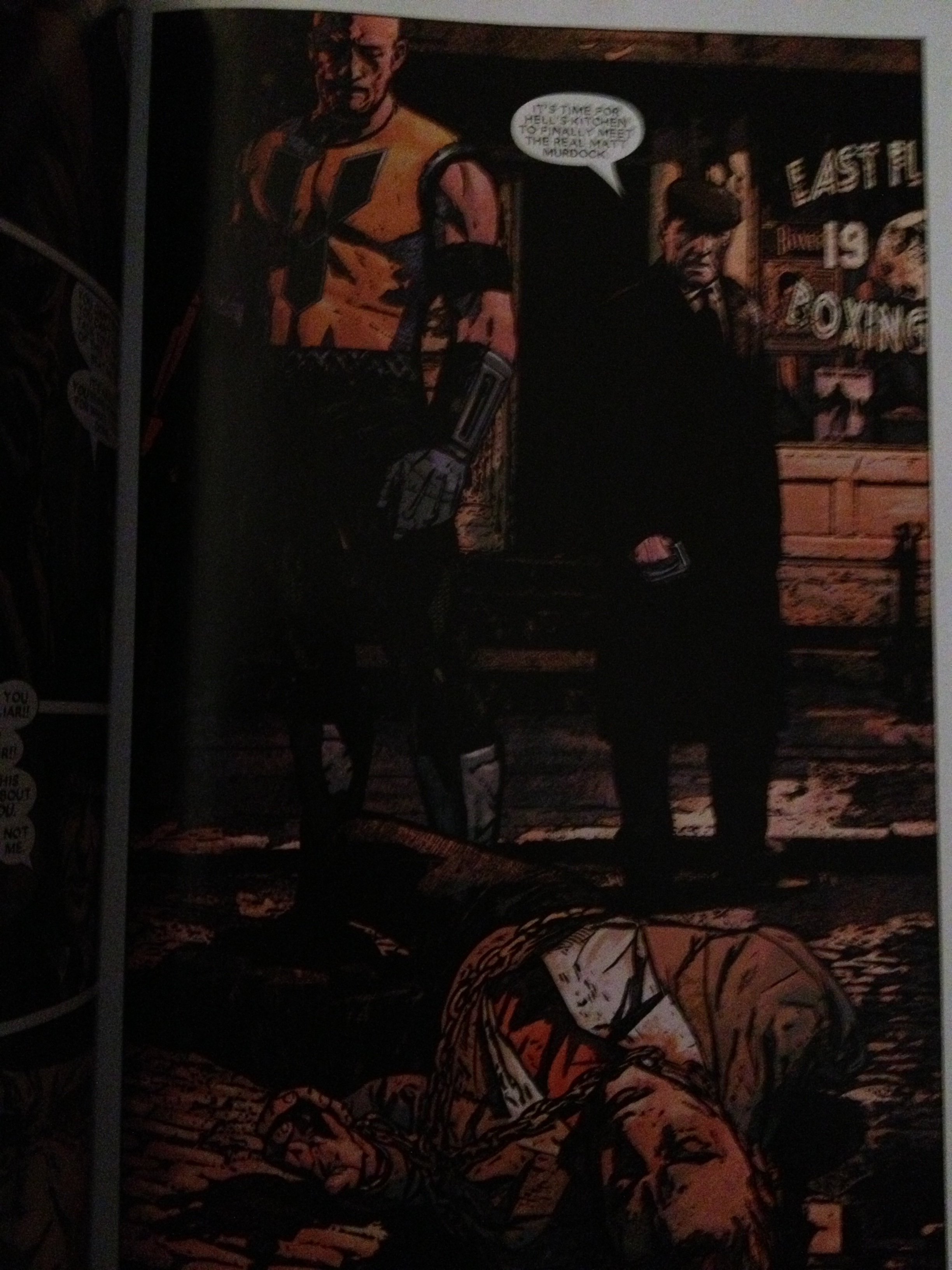Now this one I might have intended to snatch and stuff into my bag by some kind of instinctual gravitation. I had already read half of it, and was past the point of turning back on the volume. Before anyone gets irate that it wasn’t top of my list, I’ll explain. I’m entirely new to DAREDEVIL. This is it. This is the first thing I’ve read. And it’s fair to say I may not have made the best choice in picking this volume, which collects issues 66-70 of the Marvel Knights imprint. I picked this one up in the store because I’m an avid fan of Brian Bendis’ work and when I opened the book, the art work by Maleev was very appealing to me in it’s messy, noirish sensibilities. What I didn’t realize when I bought the volume was that it alternated between several points in time, all dealing with Daredevil history, which I knew nothing about. Reading the first two issues collected in the volume was agonizingly slow for me, but at the same time doubly frustrating because the artwork was so beautiful. Somewhere about half-way through reading it, I picked up steam, and began to realize that the story of former Kingpin Alexander Bont’s revenge against Matt Murdock in a very public forum of street-shaming was essentially being told backward. But, as a new reader, I was just pleading for a single panel that had a clear shot of what Murdock even looked like, or Daredevil for that matter. It came together eventually, and was worth the effort. Within an hour of arriving in my storm-bunker I had read the rest. It’s a great book and actually particularly appealing to someone like me who enjoys metatext on the different historical eras of superheroes.