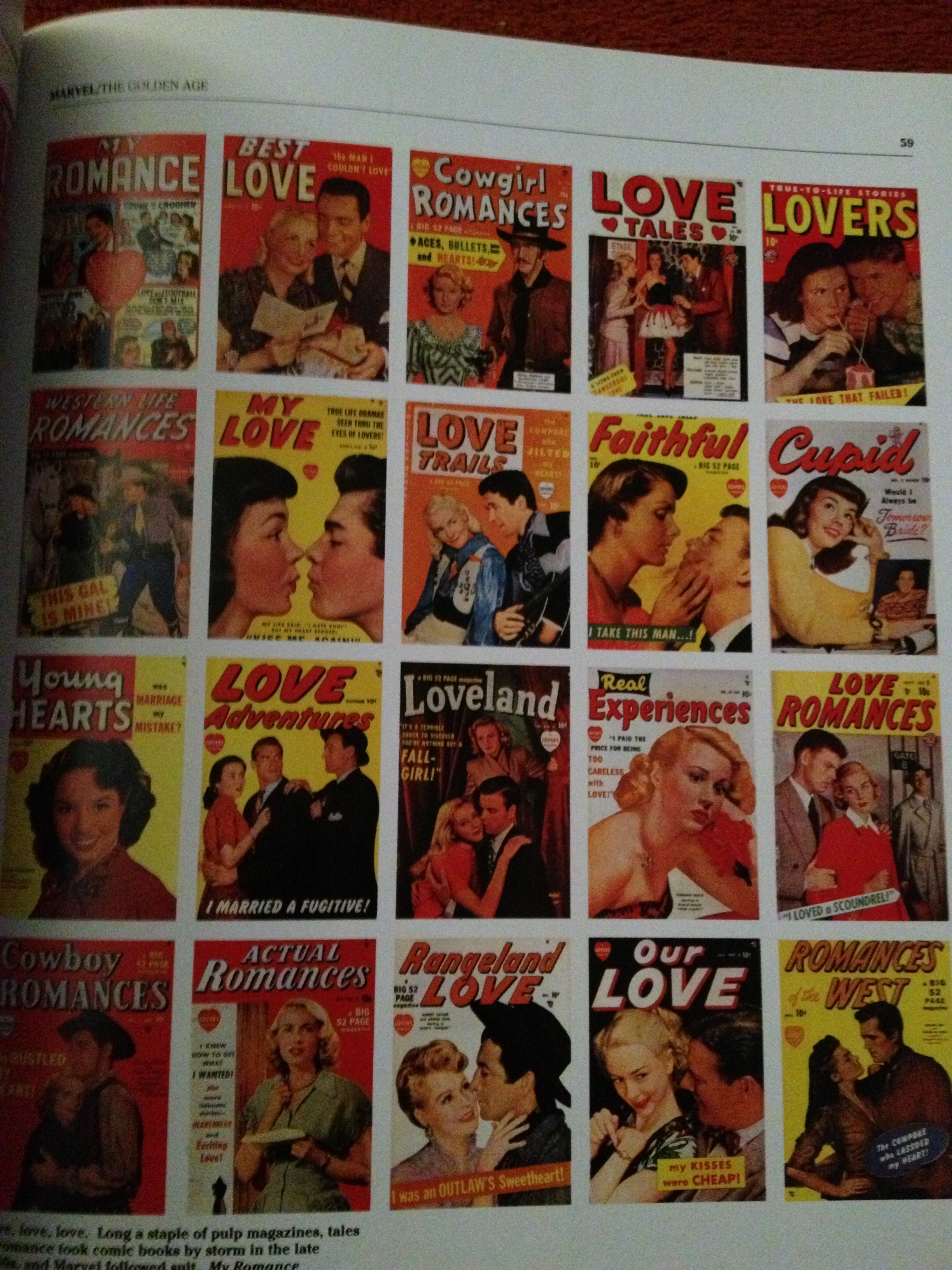 Everyone seems to know about this book except me. When I found it second hand in mint condition for only a few dollars last week, it seemed like a no-brainer, but opening it sealed the deal. While it’s a good, general history of Marvel that takes you up to 1990 or so, and it also has some intriguing quotes from the likes of former Marvel editor Jim Salicrup, the real selling point are the lavish full-color reproductions and illustrations. Nearly every page is twice as vibrant as you expect it to be and it starts with the early days of Marvel. This means you can view whole pages of romance comic covers you might otherwise have never gotten to peruse, wartime comic covers, and of course, highlights of the Marvel Age. It’s a different kind of book than Sean Howe’s gripping MARVEL: THE UNTOLD STORY, more of an art book with historical context and some Marvel insider perspectives provided, but for a few dollars, there’s definitely a place for it in my archive.