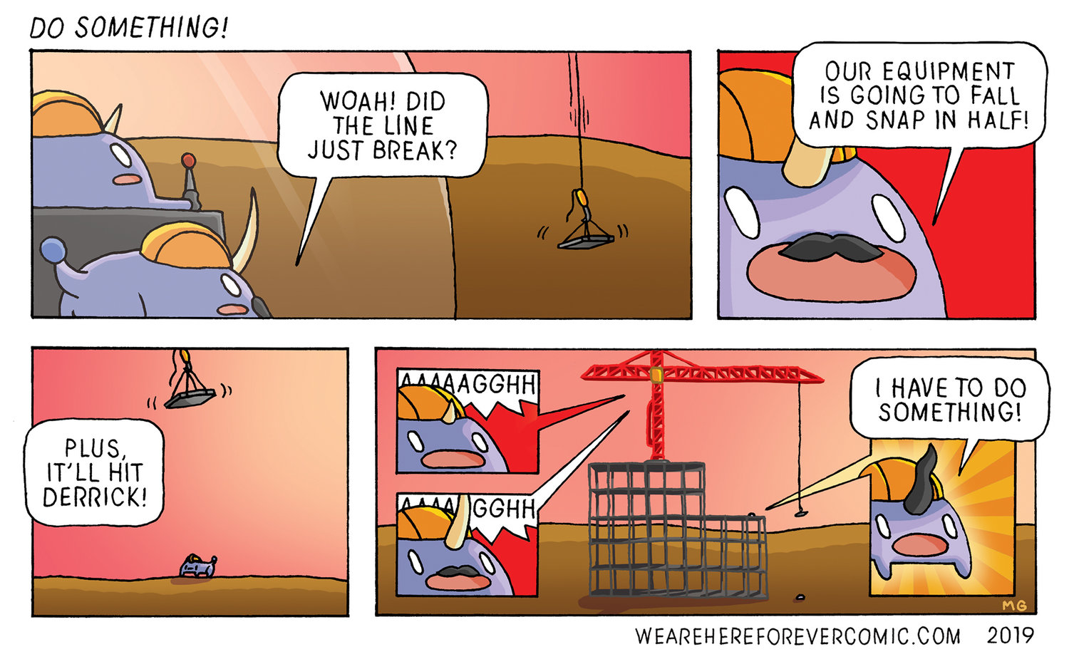 You can read the webcomic chronologically or in random bursts — whichever floats your boat. The current arc follows Brian as he attempts to work on a construction site as the Puramus build homes that are sized for them, rather than for humans. Brian’s really doing his best, but he’s having a hard time managing his tasks…