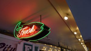 Walk back in more spitting rain, admiring the flounders on the awnings outside the Nordstrom store along the way. I can’t make this up, folks. It’s real. Some really neat deco touches on a lot of the buildings downtown, quickly being overshadowed by the new construction, a lot of it Amazon-driven, by my understanding. Marched down to the market again for breakfast, this time for a biscuit sandwich at Honest Biscuits (though folks swore by Biscuit Bitch closer to the convention center, but without seating and in the cold, really not an appealing choice.) I might’ve eaten a buttermilk bar and sipped hot cider while browsing through a used bookstore while Portishead’s first album blasted from the store’s speakers. That might’ve happened.