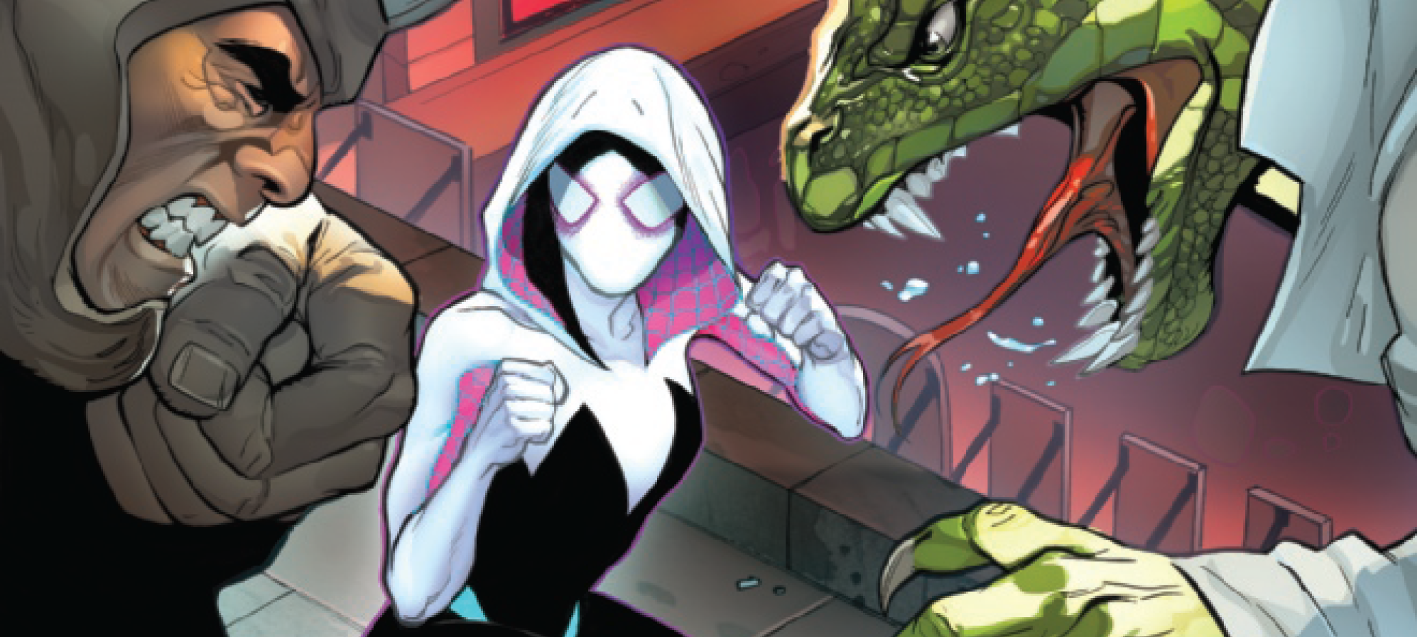 Ghost-Spider Annual (2019) #1 continues Marvel’s Acts of Evil event, which pits heroes against unlikely foes. Gwen joins the likes of She-Hulk, Wolverine, the Punisher and others for the series of annual issues (which aren’t interconnected, but do share that defining trait).