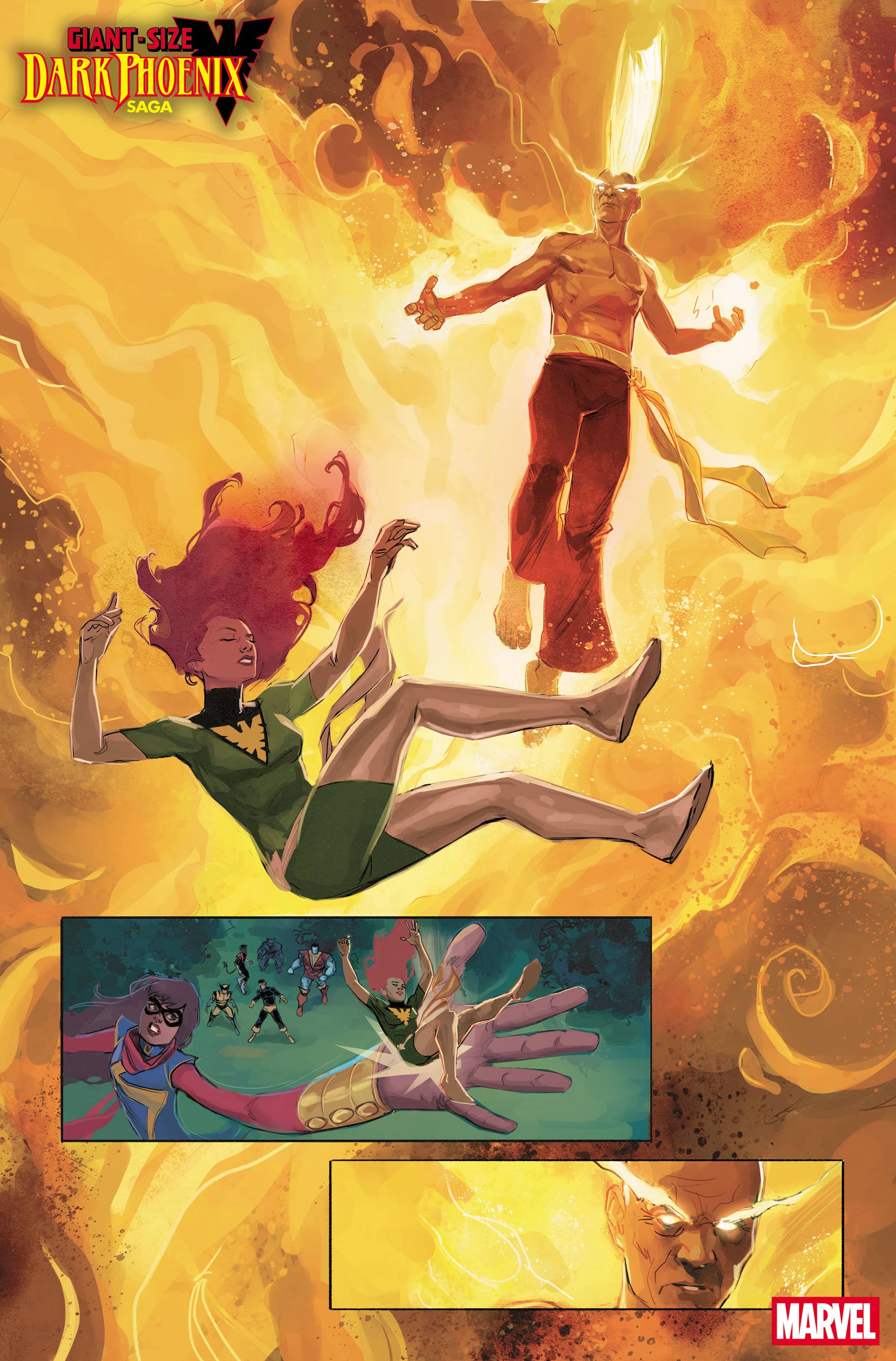 The event sees Ms. Marvel pulled into the distant past by an unstable and unleashed Legion! Locked in a battle through time against the Omega-Level mutant, Kamala is only one standing in the way of X-Men history being warped forever! Following GIANT-SIZE X-MEN #1 where Kamala joins the legendary All-New, All-Different X-Men on their critical rescue mission to Krakoa, Kamala goes from the frying pan into the Phoenix fire in GIANT-SIZE DARK PHOENIX SAGA #1. As the story we know unfolds before her eyes, the new mutant must team up with Jean Grey in her darkest hour and master her dangerous new mutant power in this cosmic, emotional saga.